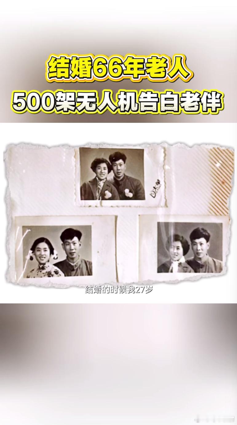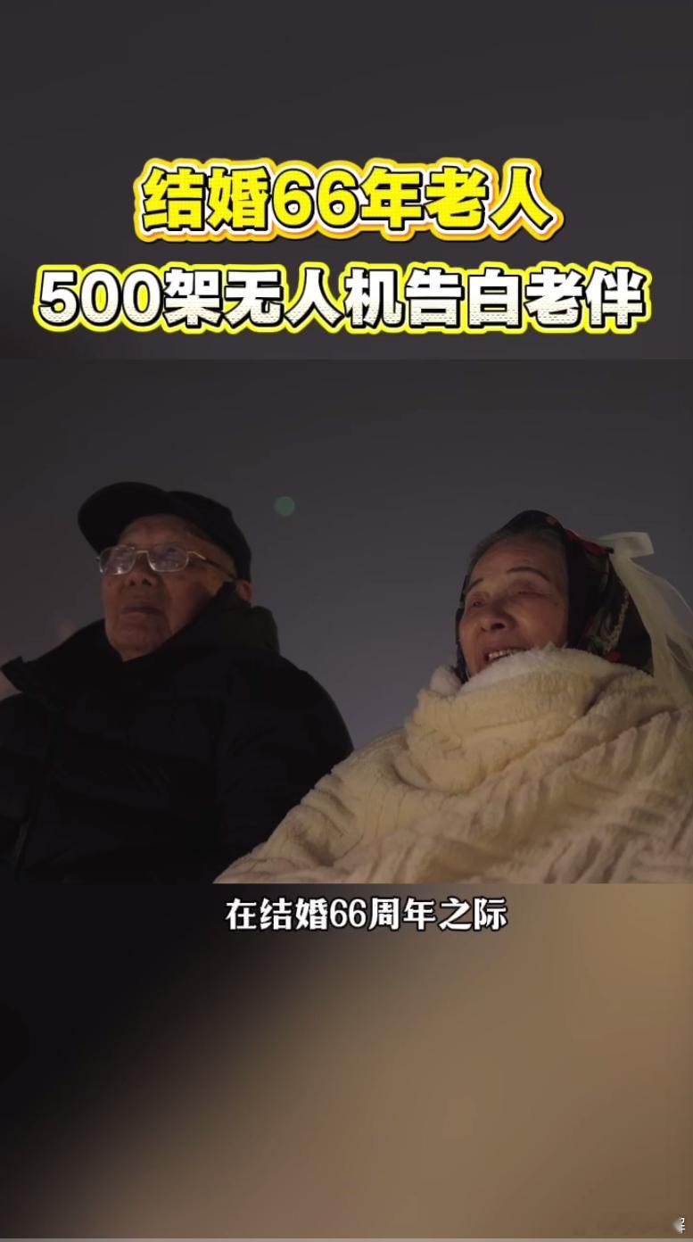 结婚66年老人500架无人机告白老伴 从三十斤水果糖的简单婚礼,到五百架无人机的盛大告白,爱从朴素走向璀璨,始终初心不改66年前蚊帐中的一束灯变成满天星