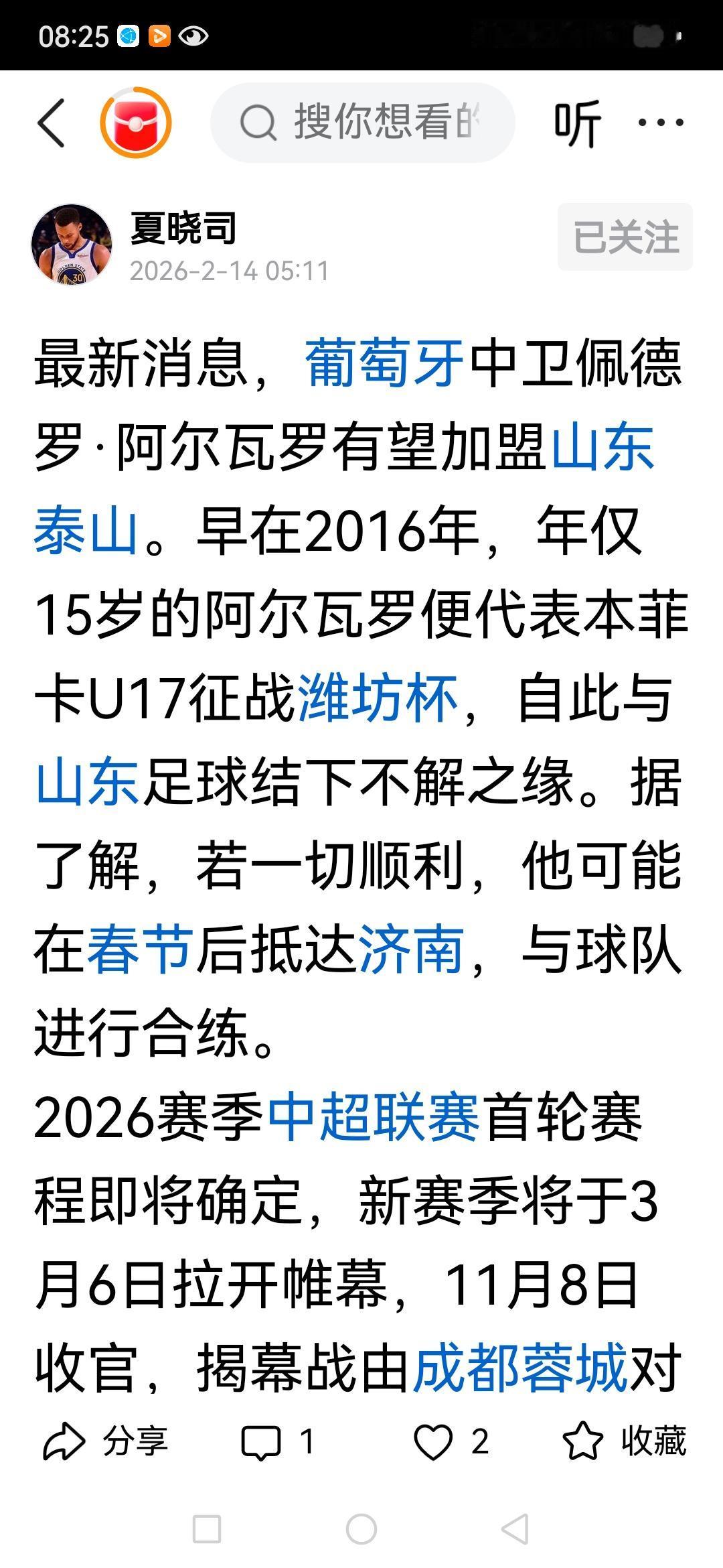 泰山队新外援中卫今天终于来了,也算是给山东球迷新春礼物吧,随着球队跟队记者确认和新外援到来,山东泰山队年前也配齐了5名外援。 山东泰山队新外援阿尔维罗,今年25岁,葡萄牙队国青队主力中卫,身价200万欧元,比瓦科、泽卡身价高,2026年2月与原俱乐部达成友好解约,以自由身身份进入转会市场,和泰山队正式签约。 他全年黄牌2张,无红牌、无送点记录,防守动作干净规范 187cm身高搭配优秀落点判断,定位球攻防两端具备统治力。防守选位精准,位置感极佳,极少出现上抢失位、盲目犯规等问题。 出球能力稳健,短传精准、长传具备转移能力,适配传控与反击体系。阿尔瓦罗出自葡萄牙本菲卡俱乐部的青训体系,曾入选葡萄牙U19、U21青年国家队。2021至2025年间,他效力于葡超埃斯托里尔俱乐部,累计出场超100次。 阿尔瓦罗,身价200万欧元,应该是目前中超后卫外援最大牌的了,而且还是自由身免签,山东泰山队选到大鱼了。这哥们职业经历和身价,感觉面对中超肯定比之前三位靠谱多了。这又来一个说葡萄牙语的,还是为了和巴西帮好交流啊,还省了翻译费。 泰山队5外援配置,这个阵容加上即将体检后签约的阿尔瓦罗,新赛季阵容挺不错的。 前场德尔加多,段刘愚,李小恒做前场三叉戟的替补,高准翼和黄政宇,都是万金油球员,可以做中后场各个位置的补充。感觉阿尔瓦罗防守属性比贾德松强,进攻能力特别是头球能力没有贾德松强。身价摆着的,比前几任强。山东泰山队的外援配置放在中超绝对是独一档,再加上那么多国字号的国内球员,中超冠军有戏。