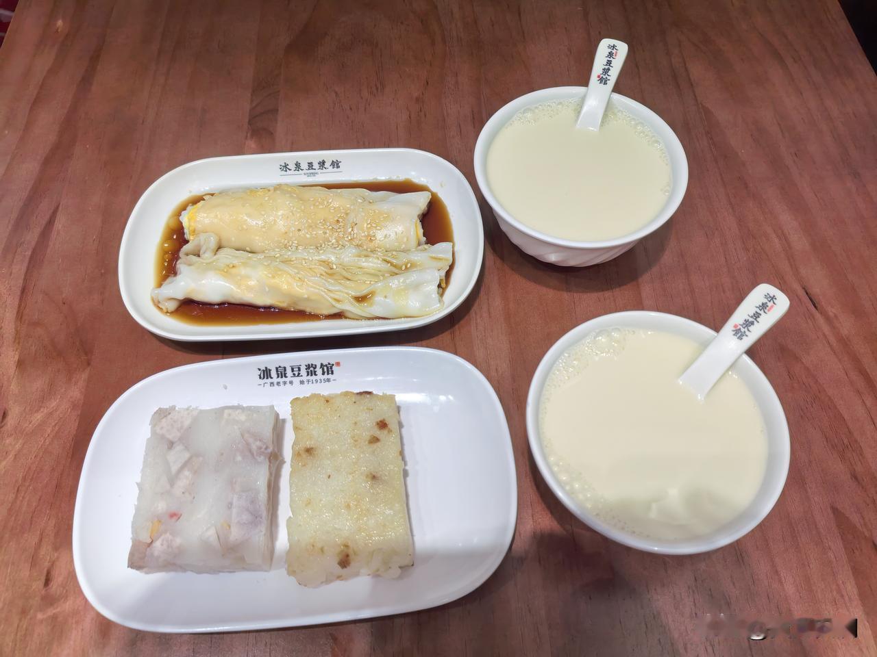 若前往广西梧州,《冰泉豆浆馆》定是不容错过之地。它作为广西的老字号,创立于1935年,还是自治区非物质文化遗产代表性项目。 《冰泉豆浆馆》位于万秀区城南街的“中国骑楼城”牌坊对面、冰泉冲附近,此地的“冰井泉香”已有上千年历史。豆浆采用古法工艺制作,原料皆经精心挑选,每一滴都弥漫着浓郁的香气。我去的时候,门口排起了长队,店内几乎座无虚席。我点了农家鸡蛋肠粉、腊味萝卜煎糕、虾米腊味芋头糕和冰泉滴珠豆浆。豆浆口感醇厚丝滑,糕点味道也十分不错。怪不得有这么多人慕名而来,广西特色美食果真名不虚传。