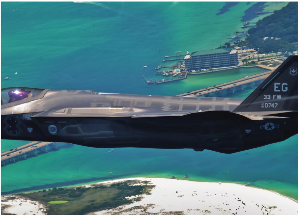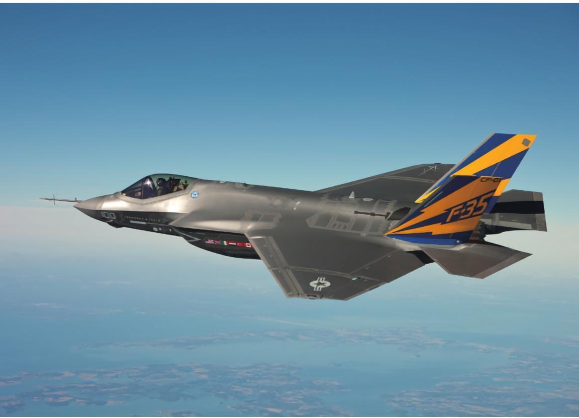 F-35由于军方对技术要求不高,因此最高飞行速度仅1.6马赫,超音速巡航能力不高。这方面F-35似乎和三代战机没有太大差别。但F-35的机动性能并不差,通过精确的气动布局设计,再加上先进的飞控计算机,该机拥有比三代机更优越的机动性。但客观来讲,F-35并非强调空战性能,推力并不太强劲(推重比尚不如F-15),因此与F-22颇有差距。F-35的机载设备比F-22更现代化,但由于雷达天线直径的限制,探测能力不能达到F-22那样的水平,但其APG-81有源相控阵雷达要比多数战斗机的机载相控阵雷达先进得多。而且该雷达拥有合成孔径雷达地图测绘(SAR)和地面移动目标指示(GMTI)的能力,可使F-35获得出色的对地攻击能力。
