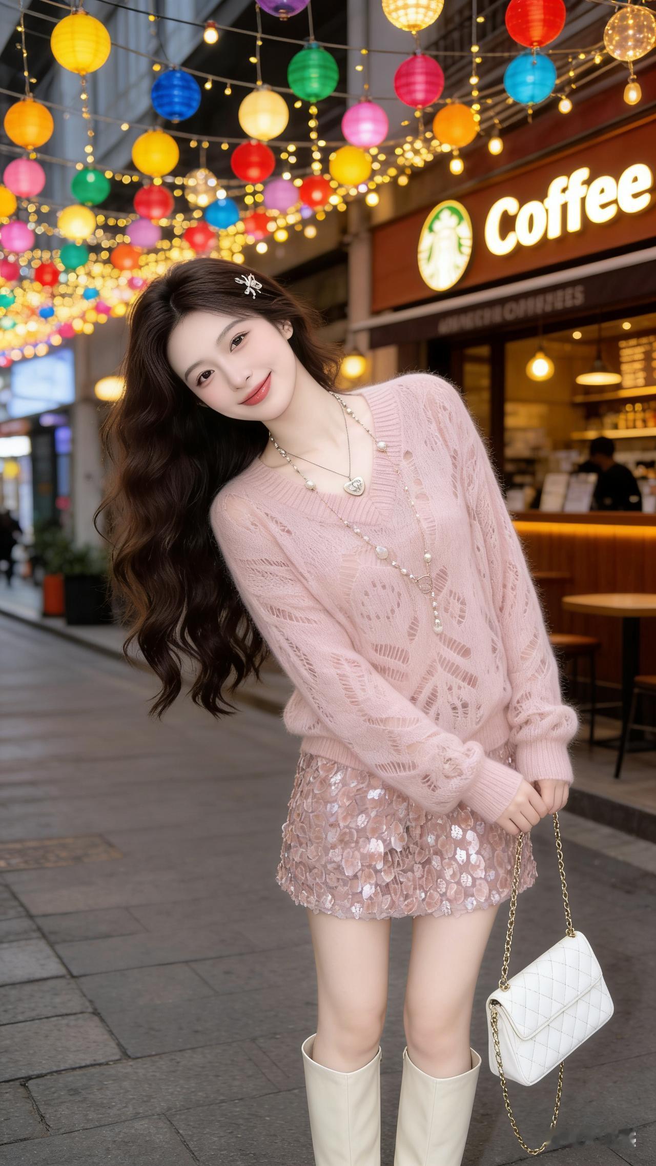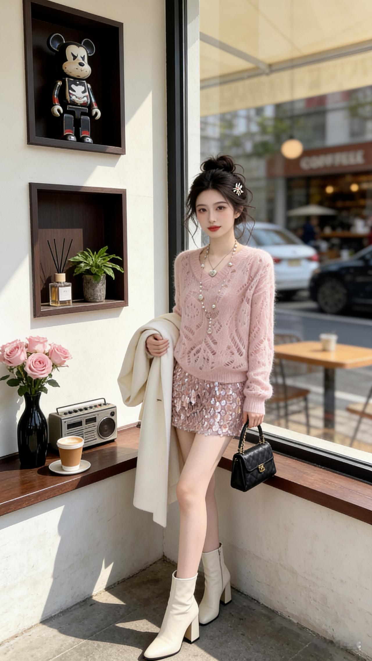 粉色毛衣+蕾丝短裙,搭配米色靴子,复古又时髦!👗👠