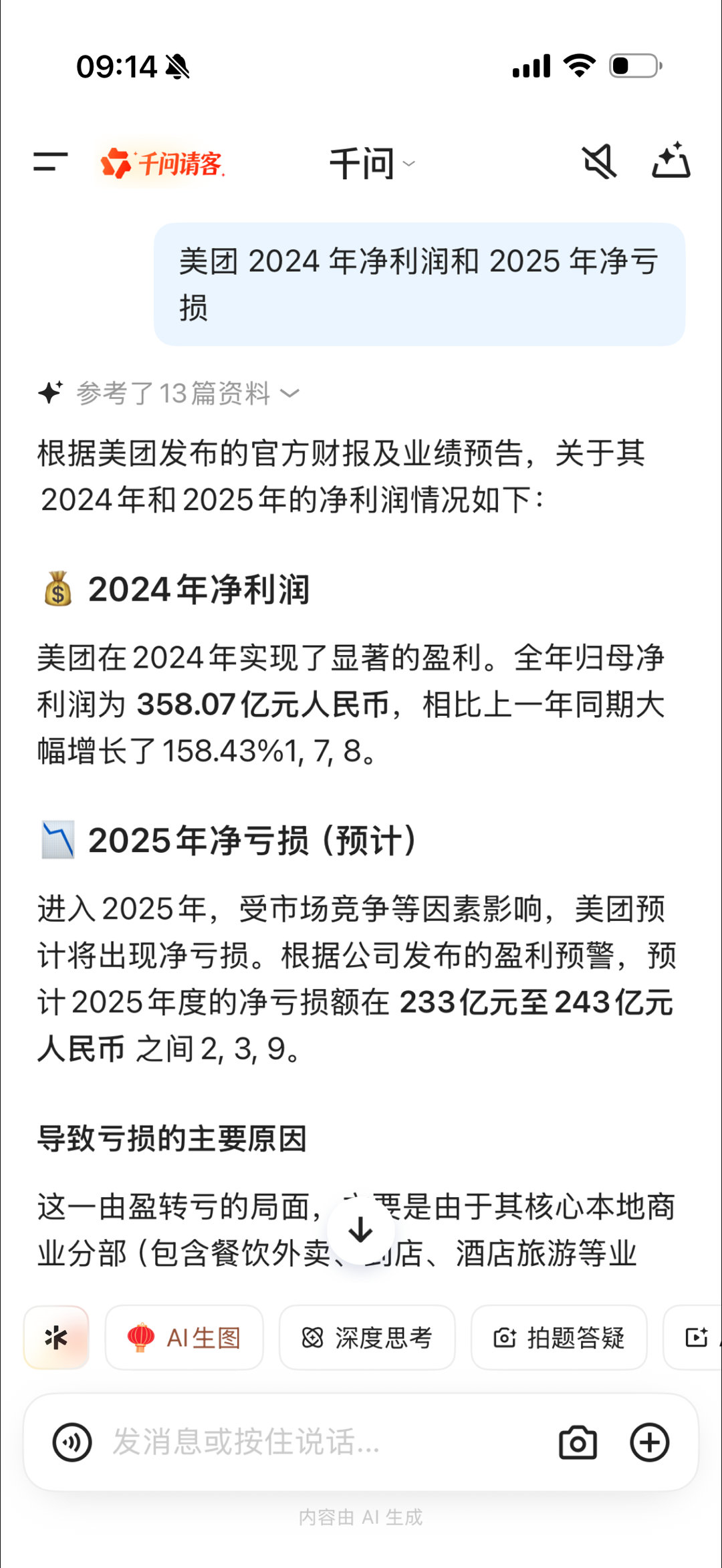 美团:2024年度净利润约为人民币 358.08 亿元2025净亏损约人民币 233 亿元至 243 亿元