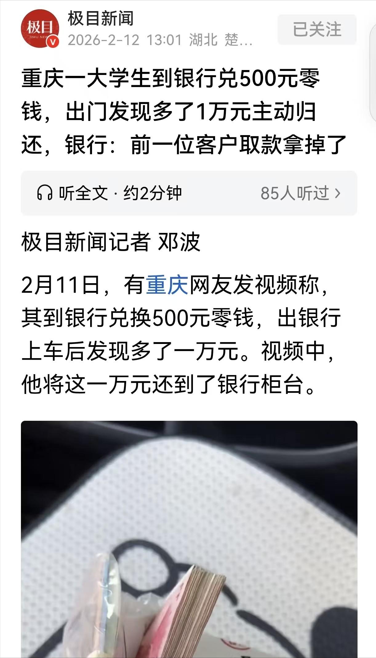 重庆,一小伙去银行兑500元零钱,柜员把500张崭新的1元面额的纸币,装进袋子里,卷成一块给了他,男子没清点,回到车上才发现多出10000元,是一沓百元大钞。 发动机还没点火,车厢内的空气仿佛凝固了。这本该是一个普通的周二午后,二月十一日的重庆,天空也许透着微光,但宋健手里的东西却烫得吓人。 那天他去银行,唯一的目的就是把手里的整钱换成500张一元面额的零钞,作为生意的周转金。 于柜台之后,各项流程皆遵循既定标准,仿若被无形的程序操控,运转得机械而刻板,少了几分灵动与生气。柜员递出一个扎紧的纸币卷,宋健出于对银行专业性的惯性信任,也没那个闲工夫当面清点,抓起袋子就走出了大门。 直到坐在驾驶座上,视觉上的巨大误差才像一记重锤砸向他。 那不仅仅是他要的零钱。在那卷绿色的、面值微薄的一元纸币外壳上,竟然赫然附着一沓红色的百元大钞。不是一两张,而是整整一万块。 五百元变成了五位数。这在物理体积上是一个显眼的突起,但在心理层面上,这是一场巨大的风暴。 宋健的心跳瞬间加速。他的大脑飞速运转,像处理代码bug一样分析着眼前的状况:这绝对不是银行赠送的“大礼包”,只能是上一位储户在窗口留下的致命疏忽。 一万块,对有的人来说是两个月的工资,对有的人来说可能是等着救命的医药费。 他必须还回去。这个决定在零点几秒内就做出了,不关乎高尚,只关乎底线。但接下来的动作,却暴露了这个时代最悲凉的生存智慧。 宋健从容地从口袋中掏出手机,修长的手指灵活地滑动屏幕,轻点几下,随即开启了摄像头,动作一气呵成。 他没有直接冲进大厅邀功,而是先录制视频。他要固定证据,证明这钱是“捡”的,证明自己正在“还”的路上。 折返至柜台处,一切谜团迅速烟消云散。真相如拨云见日般顷刻大白,不再有丝毫隐晦与疑惑,一切都清晰地呈现在眼前。确实是前序客户马虎大意,取款后遗落了这沓钞票,被随后的零钱袋子“卷”了出来。 当天下午失主就领回了钱,物理世界里的圆满闭环已经完成。但在比特世界里,一场关于人性的审判才刚刚开庭。 当这段经历被抛入舆论场,网友的反应让宋健浑身发抖。预想中的点赞寥寥无几,铺天盖地的却是恶意的解构。 “装什么好人?肯定是一开始想昧下,出门发现到处是摄像头,怕坐牢才回去的。” “还是懂法啊,知道刑法270条要把牢底坐穿,这是被迫行善。” 在键盘侦探们的逻辑里,纯粹的善意是不存在的。一切行为都被还原成了冷冰冰的成本收益分析:你没拿走钱,不是因为你不想,而是因为银行的安防系统太强大。 这种“有罪推定”像一把无形的手术刀,把宋健的自尊切割得支离破碎。 他录视频是为了自证清白,在网友嘴里却成了“心虚”的表现。他归还巨款是为了求个心安,在舆论眼中却成了“畏罪”的权衡。 宋健感到一种彻骨的寒意。他以为自己在做一个简单的加法,把不属于自己的东西还回去。但社会却在对他做减法,剥离掉他的道德动机,只剩下一个被监控威慑住的“潜在罪犯”。 这才是比丢失一万元更可怕的事情。 当一个年轻人捡到巨款,第一反应不是欣慰,而是恐惧。当他把钱还回去,收获的不是信任,而是“你没胆子拿”的嘲讽。 我们常感叹好人难做,其实难的不是“做”这个动作,而是即使你做了,还得剖开肚子证明自己只吃了一碗粉。 那个下午,失主找回了钱,宋健找回了面值五百元的零钞。 但在那个封闭的车厢和喧嚣的网络之间,我们似乎弄丢了某种比金钱更昂贵的东西——那种相信陌生人可能真的只是想做好事的,最原始的能力。 信息来源:极目新闻