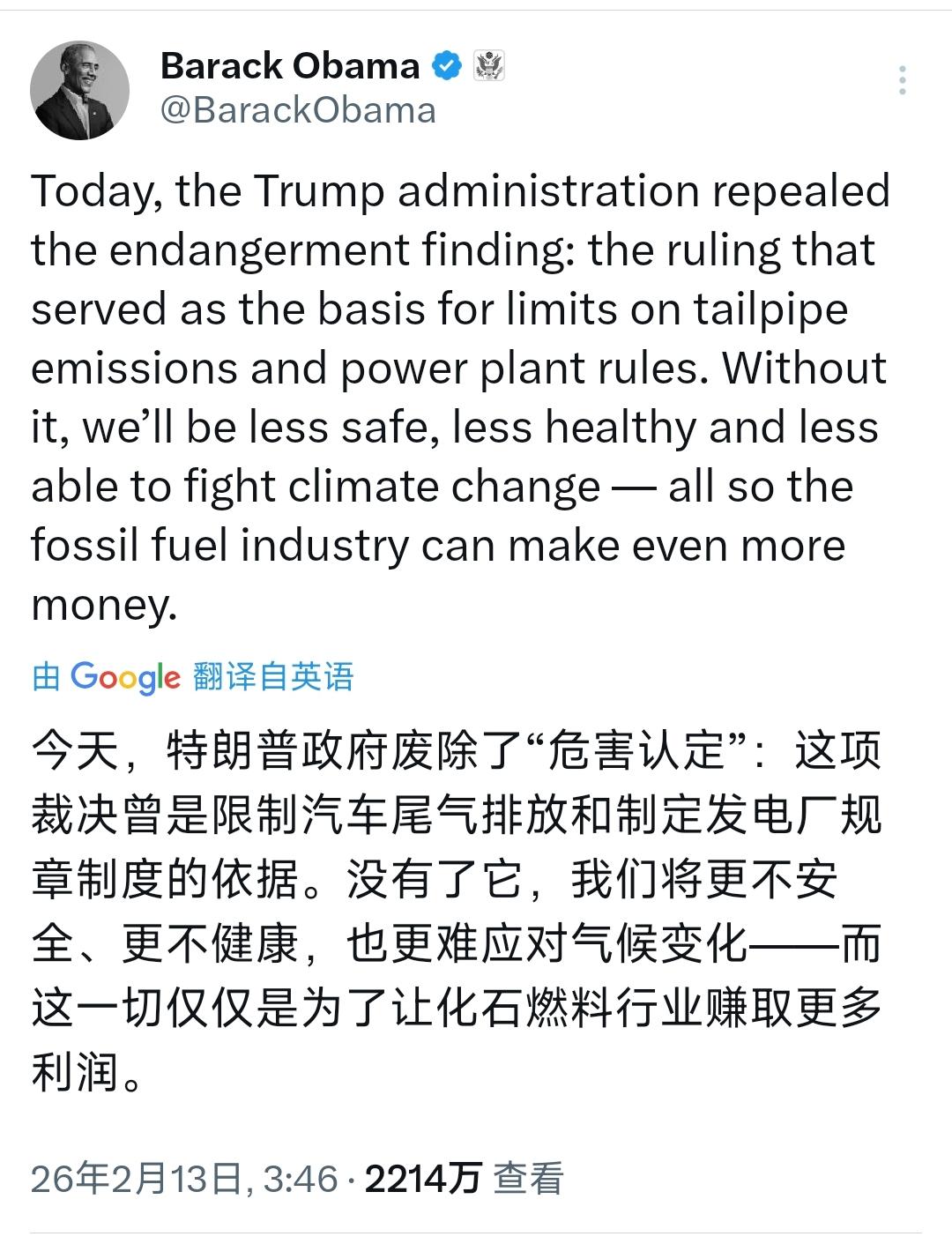 美国前总统奥巴马北京时间2月13日发文写道:“今天,特朗普政府废除了‘危害认定’:这项裁决曾是限制汽车尾气排放和制定发电厂规章制度的依据。没有了它,我们将更不安全,更不健康,也更难应对气候变化而这一切仅仅是为了让化石燃料行业赚取更多利润。” 可能很多人看到这句话,还不太明白其中的关键,其实简单来说,这个“危害认定”并不是什么复杂的政策,就是2009年美国环保署定下来的一个规矩,核心就是明确了温室气体排放对公众健康和环境是有危害的,而这个规矩,也是之前管控汽车尾气、制定发电厂排放要求的主要依据。 也就是说,在没有废除之前,汽车厂家得按照相关要求控制尾气排放,不能想怎么排就怎么排,发电厂也得遵守相应的规章制度,减少对环境的污染。 可现在特朗普政府把这个“危害认定”给废了,相当于之前那些约束汽车和发电厂排放的重要依据,一下子就没了支撑。 奥巴马之所以会发文反对,其实道理也很简单。 没有了这个认定,汽车尾气排放可能就没人严格去管了,长期下来,空气里的污染物会越来越多,人们呼吸这样的空气,身体健康肯定会受影响,这就是他说的“更不健康”。 而发电厂的排放不受约束,温室气体只会排放得更多,全球气候变化本来就越来越受关注,这样一来,应对气候变化的难度自然就更大了。 特朗普政府这么做,官方说法是为了减轻监管成本,让汽车行业能更好发展,车价也能降一点,但奥巴马直接点出了核心,说这一切都是为了让化石燃料行业多赚钱。 这话其实也不难理解,化石燃料行业比如石油、煤炭这些,本来就和排放管控息息相关,管控松了,他们的生产和运营成本会降低,利润自然就上去了。 说到底,这就是一个取舍的问题。是暂时减轻一些行业成本、让少数行业多赚钱,还是守住公众的健康,好好应对气候变化,为长远考虑。 奥巴马显然是站在后者这边,他觉得废除“危害认定”,牺牲的是普通人的健康和未来的环境,换来的只是化石燃料行业的短期利益,实在得不偿失。 而且这件事不只是美国国内的事,全球气候变化是全人类的共同问题,美国作为全球温室气体排放较多的国家,本来就有责任做好排放管控。 现在撤销了“危害认定”,相当于在气候治理上往后退了一步,不仅会影响美国自身,也可能给全球的减排进程带来负面影响。 大家对此怎么看?欢迎评论区留下您的观点!