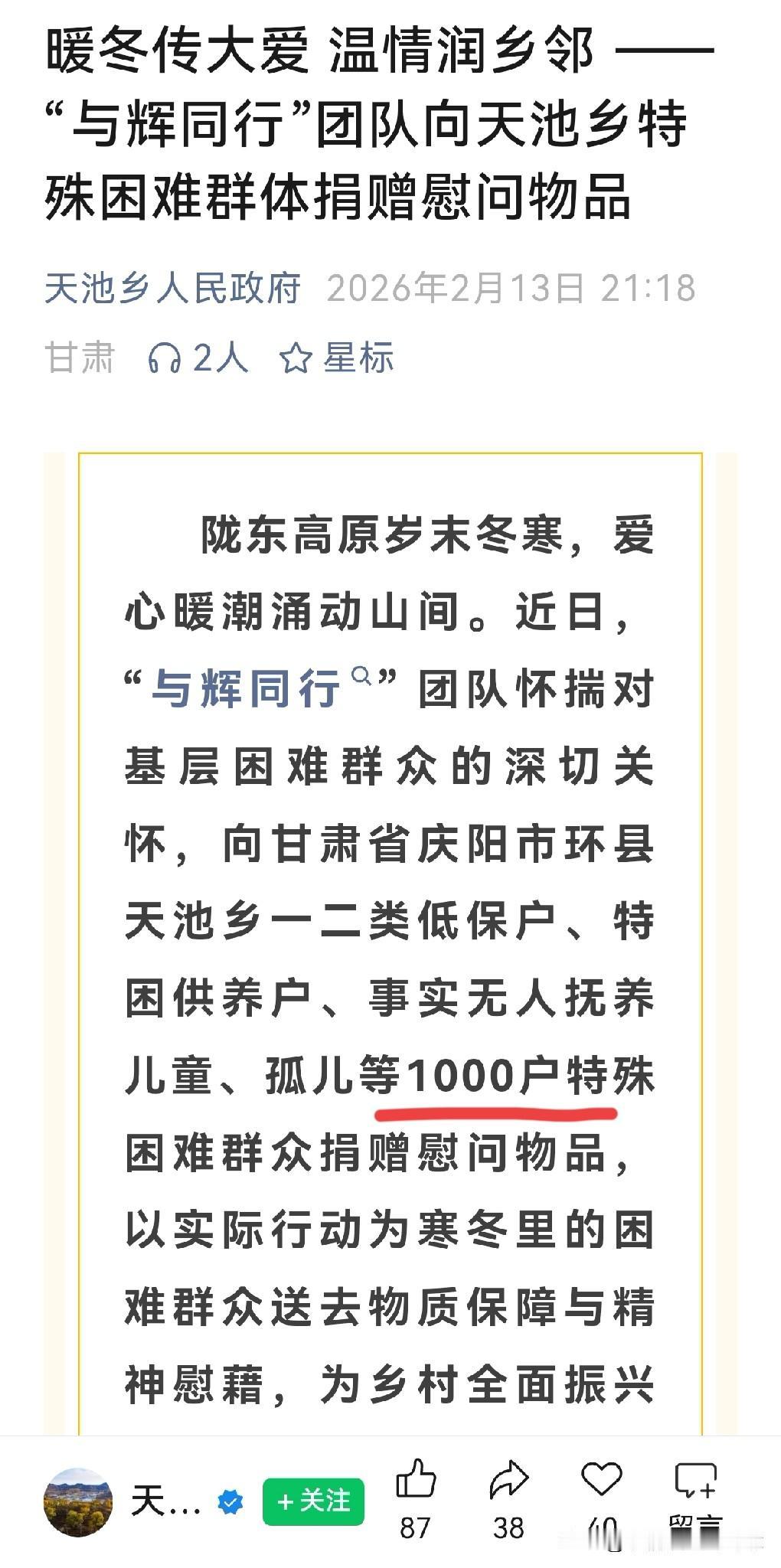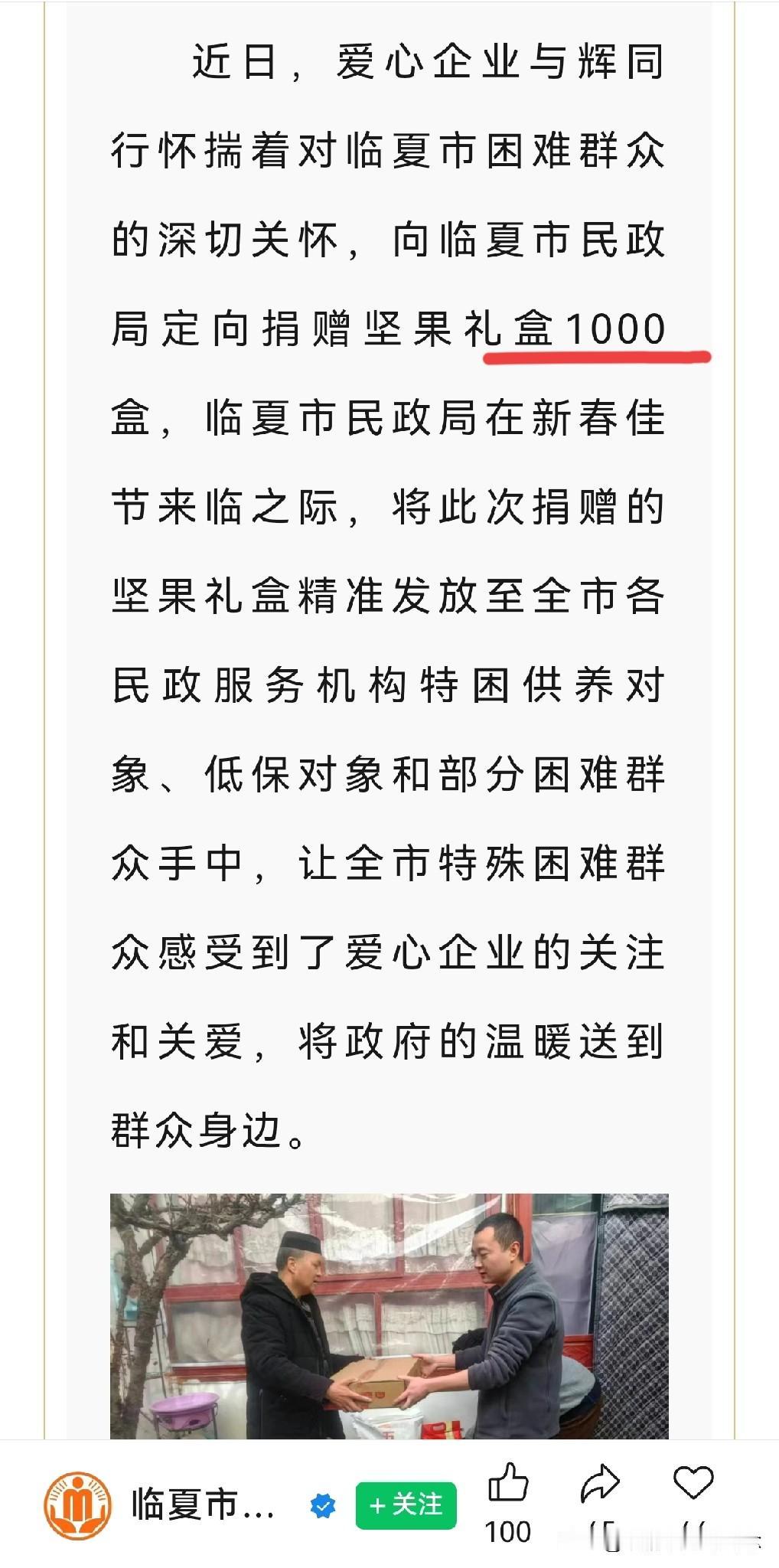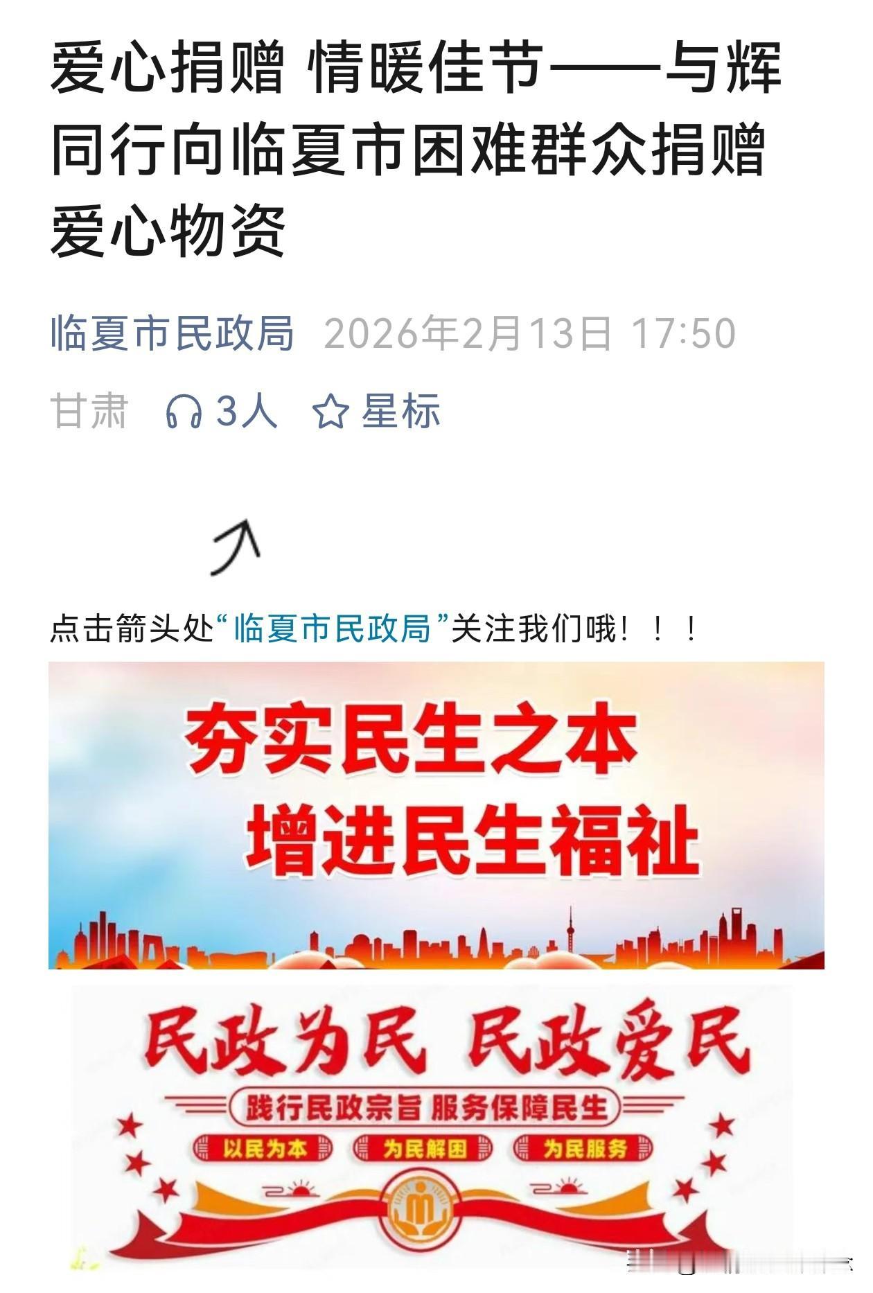 送不完,根本送不完! “与辉同行”的慰问物品又送到甘肃, 还记得去年“与辉同行”去甘肃那趟行程吗? 去年6月,“与辉同行”阅山河去了甘肃的庆阳、平凉、天水,直播间里那叫一个热闹。谁能想到,这都过去大半年了,他们对甘肃的“宠爱”还在继续! 临夏市民政局和天池乡人民政府都在自己的公众号上发文,感谢“与辉同行”的捐赠,真正帮到那些低保户,特困供养户,孤儿。 不是走过场,不是做做样子,这种感觉就像家里之前来了远方的客人,热热闹闹招待了一顿,客人走后以为就散了。结果过了半年,客人又寄来了礼物,说上次麻烦你们了,这点东西收下吧。 真是应了那句话:来过,就没忘记过。被记住的感觉,真好!