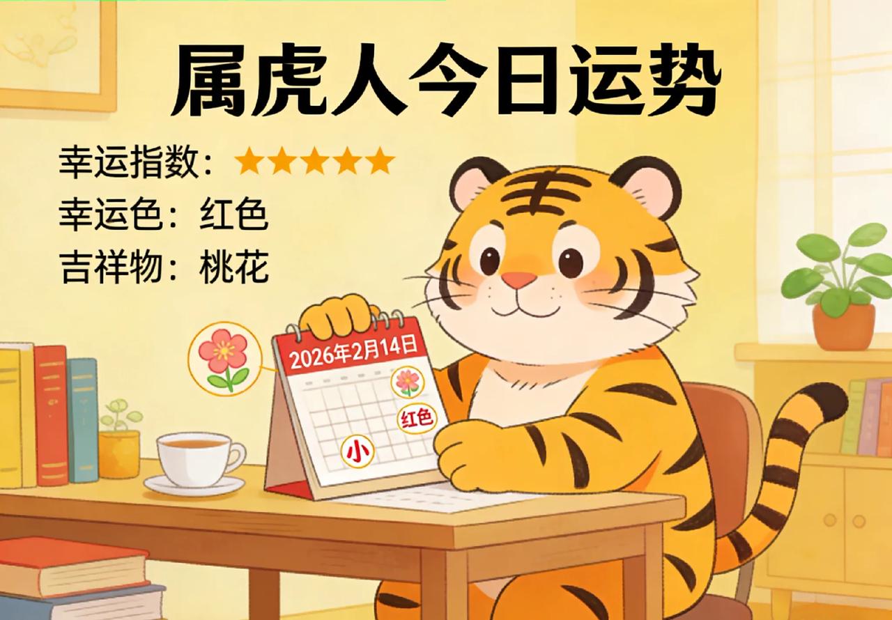 2026年2月14日 属虎人今日运势 2026年2月14日(周六),农历乙巳年腊月廿七,庚寅月己未日,值神玉堂(黄道执日)。属虎人今日以务实收尾为核心,整体稳中有喜。 事业上,适合年前结算、整理文档与敲定节后计划;遵彭祖百忌“己不破券”,暂缓签署新商业协议,避免纠纷 。正财稳定,年终奖、薪资多如期到账;偏财勿碰,大额年货与投机皆不宜,财神位在正北,可将钱包置于此方位聚财。 恰逢情人节,“天喜”桃花加持,单身者表白成功率高,与属猪、属马异性契合度佳;有伴侣者共备年货、吃顿便饭,感情更升温。健康需留意肠胃,腊月备年货易忙碌,忌暴饮暴食、少熬夜,保持情绪平稳。整体收束兼顾温情,今日更顺遂。