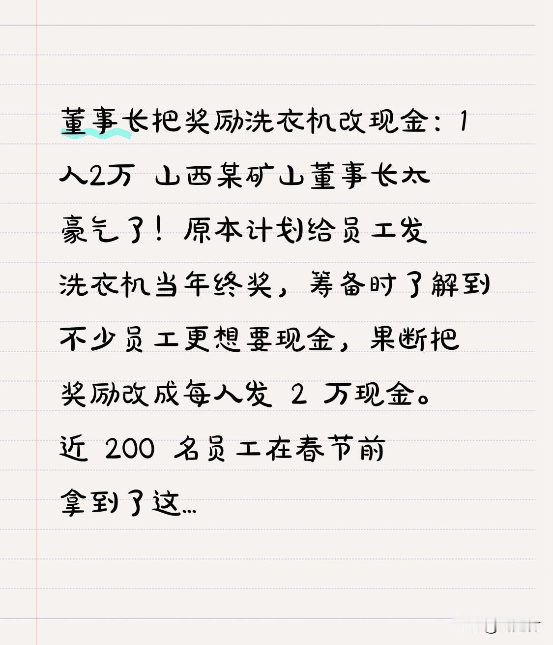 董事长把奖励洗衣机改现金:1人2万 董事长将奖励洗衣机改为现金:每人2万 山西某矿山董事长将奖励从洗衣机改为现金,每人发2万,十分豪气!原本计划给员工发放洗衣机作为年终奖,筹备时了解到不少员工更希望得到现金,董事长果断将奖励改成每人2万现金。近200名员工在春节前收获这份“意外之喜”。有员工称,这钱能交学费、看病,比洗衣机实用得多。 此事引发热议,因其切中员工实际需求。矿山员工大多来自基层家庭,现金能更好应对生活压力。中国劳动关系学院调研显示,超70%劳动者认为现金补贴更有获得感。这也折射出企业的人性化文化,不搞形式,把员工当家人,这样的老板和企业活该做大做强!