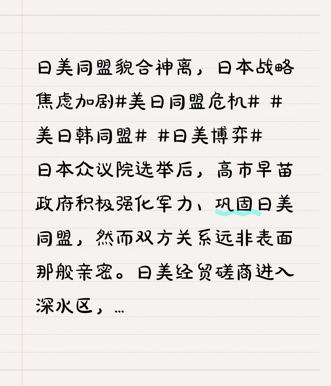 5500亿美元买来特朗普勃然大怒 日美同盟貌合神离,日本战略焦虑加剧。 美日同盟危机 美日韩同盟 日美博弈 日本众议院选举后,高市早苗政府积极强化军力、巩固日美同盟,然而双方关系远非表面那般亲密。日美经贸磋商进入深水区,日本承诺的5500亿美元对美投资推进缓慢,引发美方不满,人造钻石成为首批合作项目,意在摆脱对中国供应链的依赖。 特朗普政府对日本提出四大诉求,包括履行投资承诺、增加防卫开支、稳定中日关系等。日本虽已将防卫费提升至GDP的2%,但美方仍要求加码至3.5%,并以军售施压增购美制装备。与此同时,美国调整亚太战略,寻求对华稳定关系,拒绝在中日问题上力挺日本,令日本陷入焦虑。 日美之间利益博弈加剧,同盟充满算计与妥协,日本在追随美国与维护自身利益间进退两难,未来外交与安全风险上升。中美日地缘博弈 美日关系 日本美国会谈