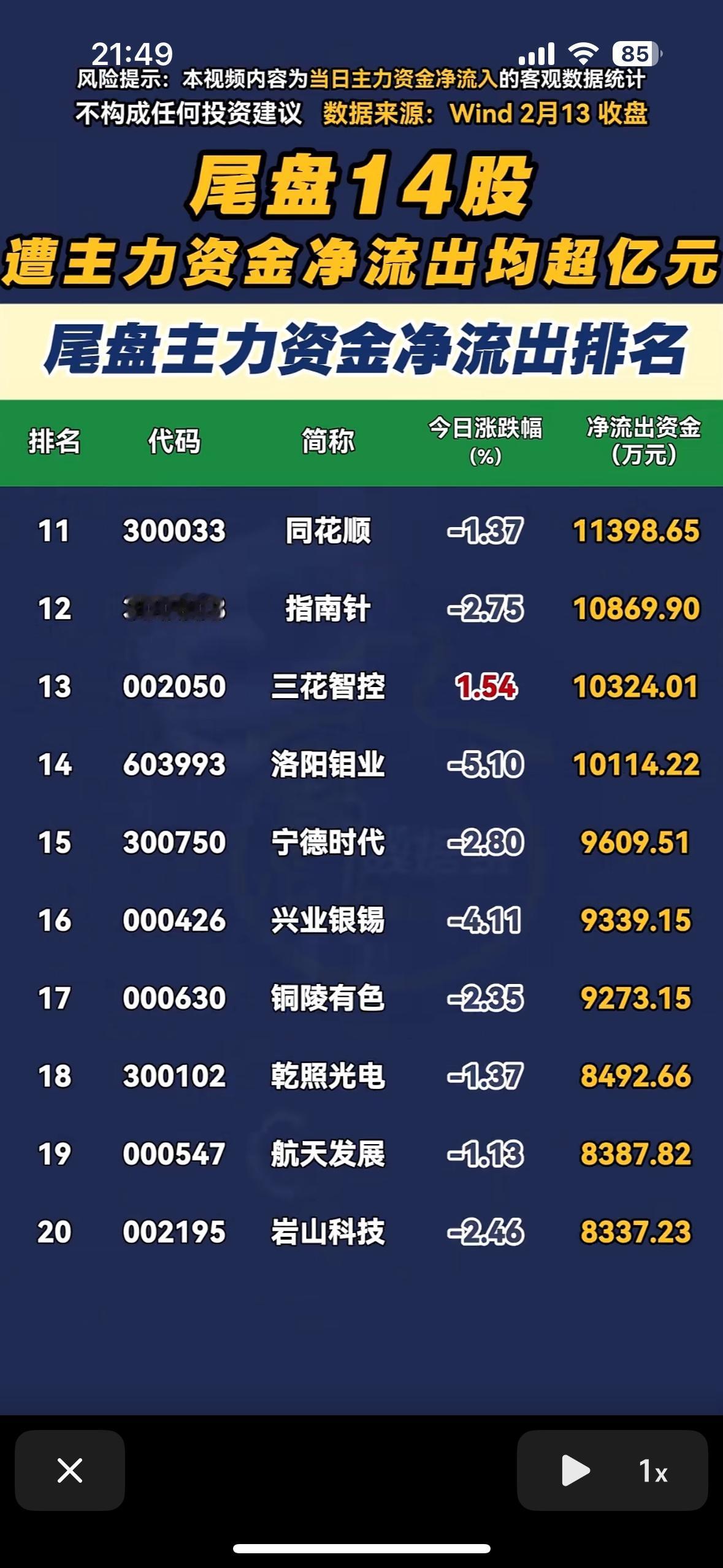尾盘有14股主力资金净流出超亿元,可别盲目去抢筹啊。就像8月30号,沪深两市主力资金虽净流入182.57亿,可沪深300成份股主力资金净流出55.64亿呢。当日申万一级行业里,银行指数下挫2.21%,银行主力资金净流出10.19亿居前,工商银行主力资金净流出就达4.6亿。 而那些主力资金净流入多的股票表现不错,像万科A主力资金净流入6.06亿还盘中罕见涨停。投资得谨慎分析资金流向和行业趋势,不能光冲着主力资金流出的股票就去抢,否则可能就掉进坑啦。