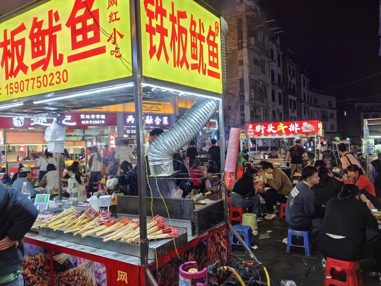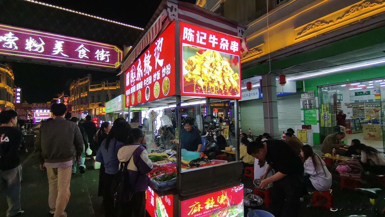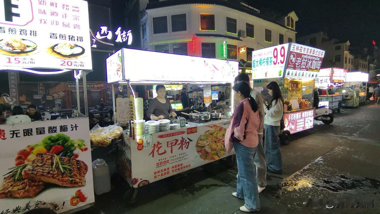 腊月二十五,去了玉林十字街,那热闹劲儿,简直绝了!这里不愧是玉林的中心地带,节日氛围直接拉满。商业百货区是购物休闲的好去处,而嗦粉街更是人满为患。街道两旁摊位林立,灯幌随风摇曳,各式各样的小吃让人眼花缭乱。 有经典的螺蛳粉,还有煎秋刀鱼、羊肉串、鱿鱼须等。烤生蚝滋滋冒油,花甲粉鲜香入味,广西酸嘢清爽解腻,玉林牛腩粉更是不容错过。一路吃过去,肚子圆滚滚的,像个“皮球”似的。吃饱了得走动走动消化消化,这一趟逛得别提多满足了。想去感受热闹氛围、品尝美食的,可千万别错过!