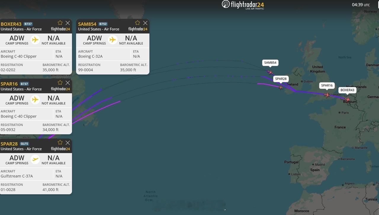 代表团成员乘坐BOXER43 (02-0202) 和 SPAR16 (05-0932) 两架C-40C运输机、SAM854 (99-0004),一架C-32A运输机,以及 SPAR28 (01-0028) 一架C-37A运输机。
