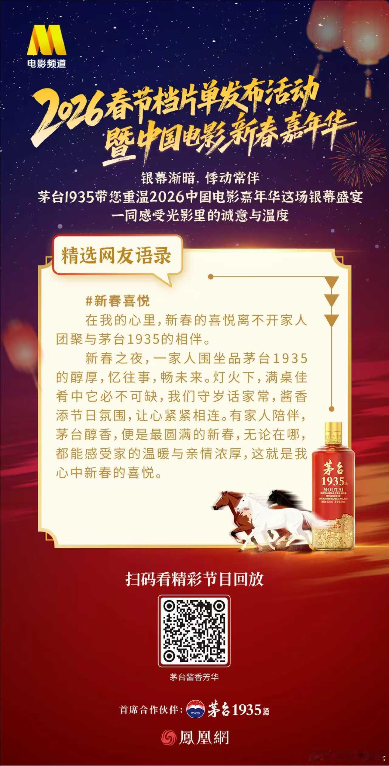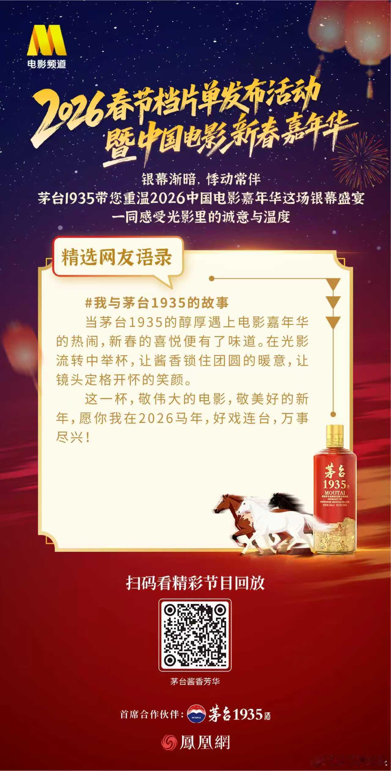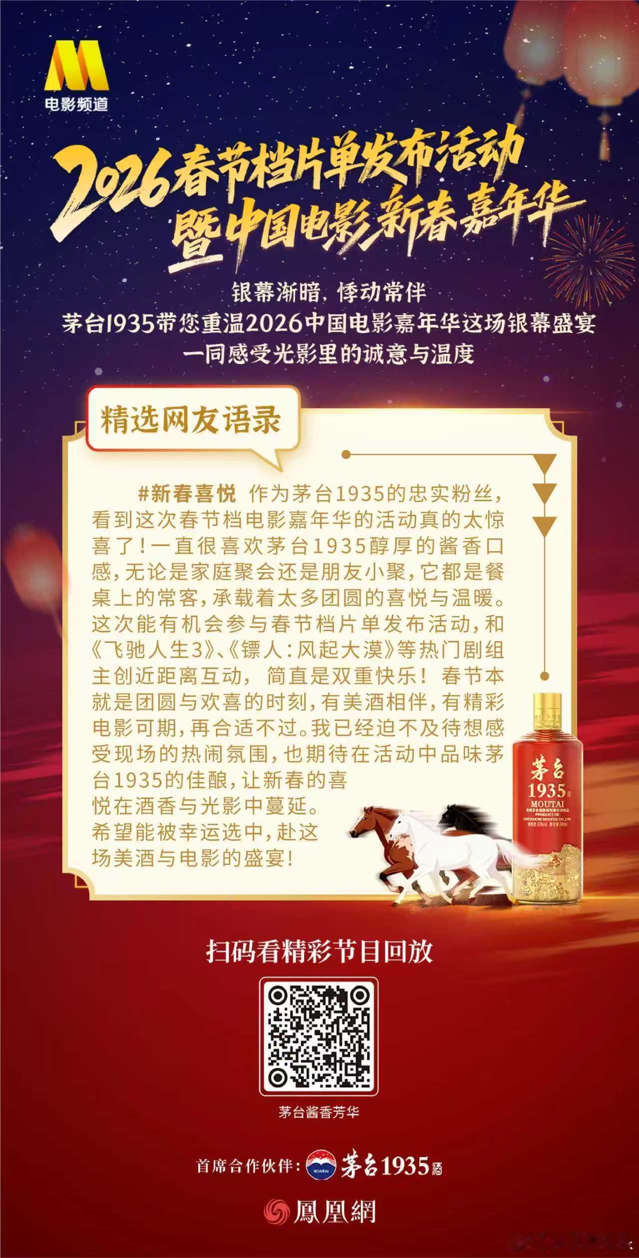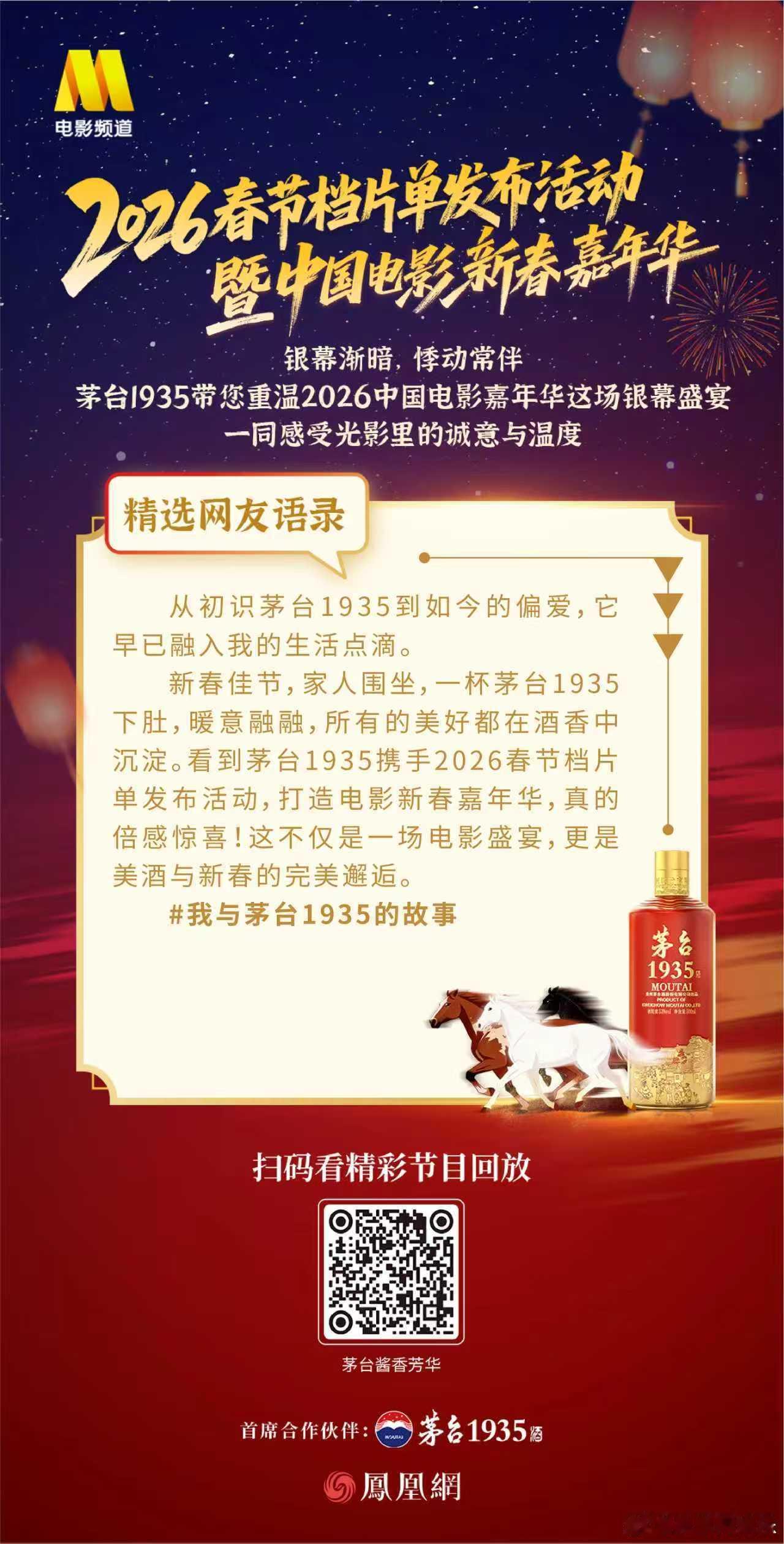 喜逢时代芳华共筑光影之美2026中国电影新春嘉年华 银幕渐暗,悸动常伴。茅台1935带您重温2026中国电影嘉年华这场银幕盛宴,一同感受光影里的诚意与温度。茅台1935喜迎新春