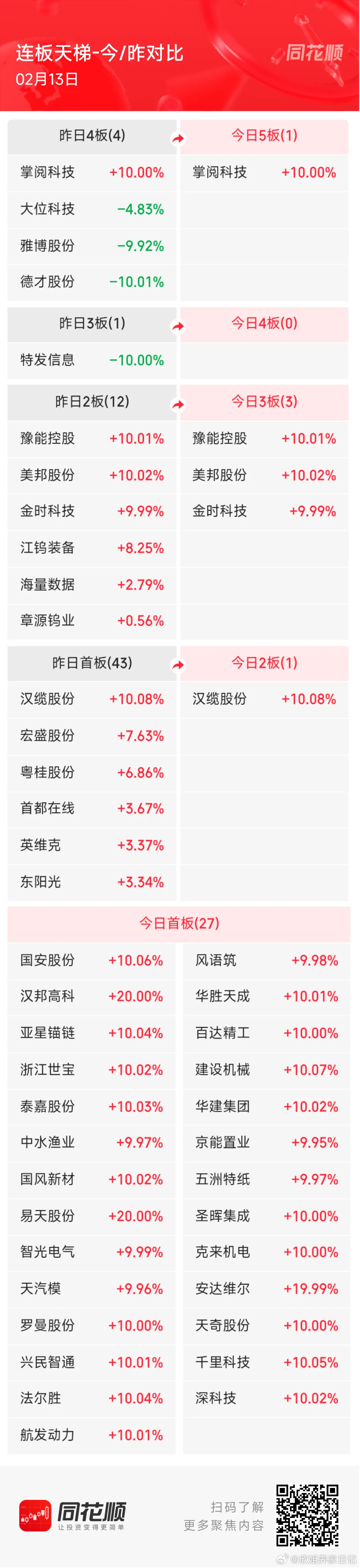 1、五连板:掌阅科技2、三连板:豫能控股、金时科技、美邦股份3、二连板:汉缆股份4、首板:风语筑、国风新材、国安股份、汉邦高科、建筑机械、中水渔业、深科技、航发动力等