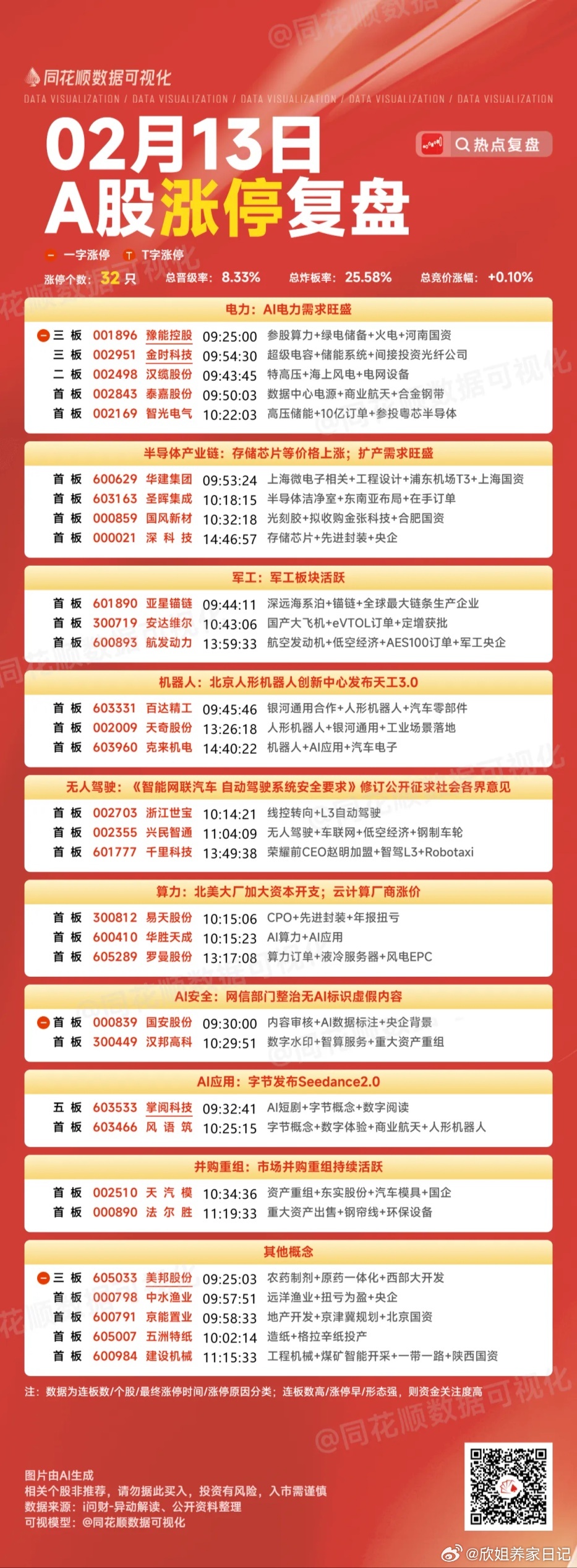 2月13日,涨停复盘(32只),包括电力、半导体、军工、机器人、算力等板块。