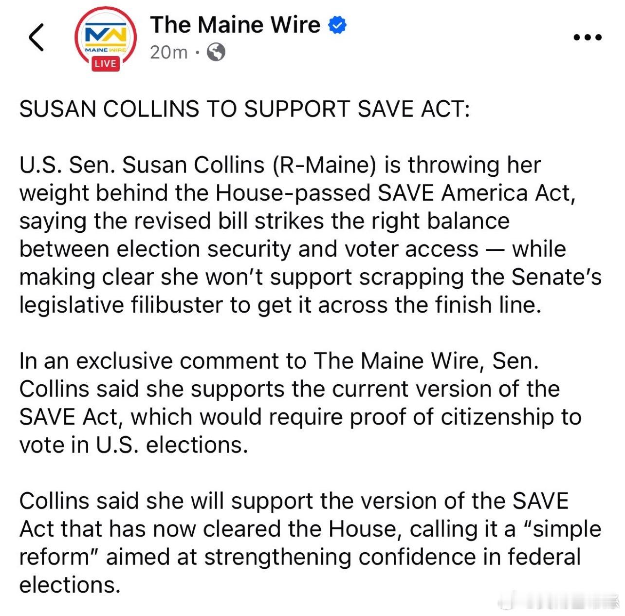 哇,好消息! 🥳 共和黨參議員Susan Collins在接受《緬因州電訊報》獨家採訪時表示,她支持修訂後的《拯救選民法案》,該法案要求在選舉中投票時必須出示美國公民身份證明。她稱該版本在選舉安全和投票權之間取得了適當的平衡——同時她也明確表示,她不會支持取消參議院的立法阻撓議事規則以使其最終獲得通過。