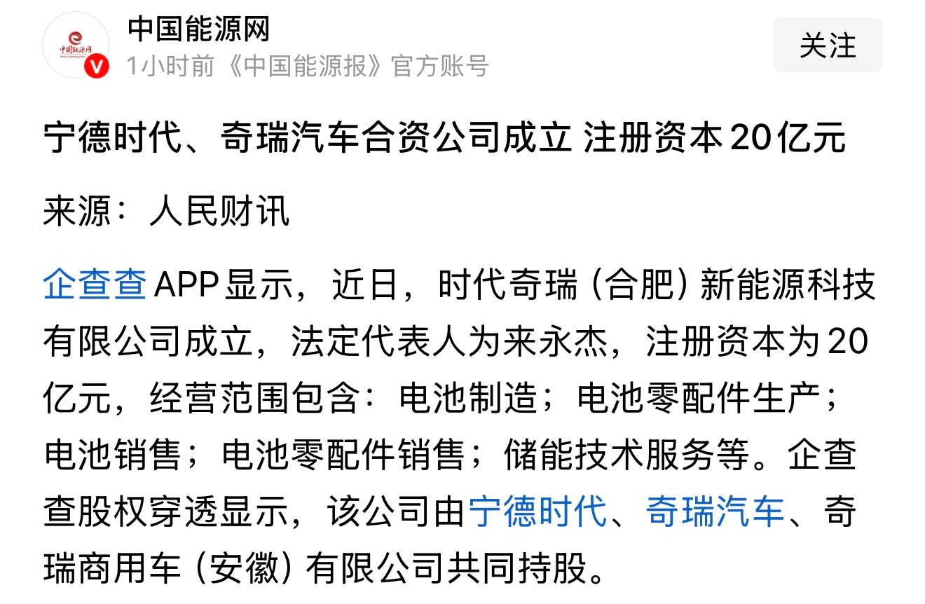宁德和奇瑞这是要干大事!