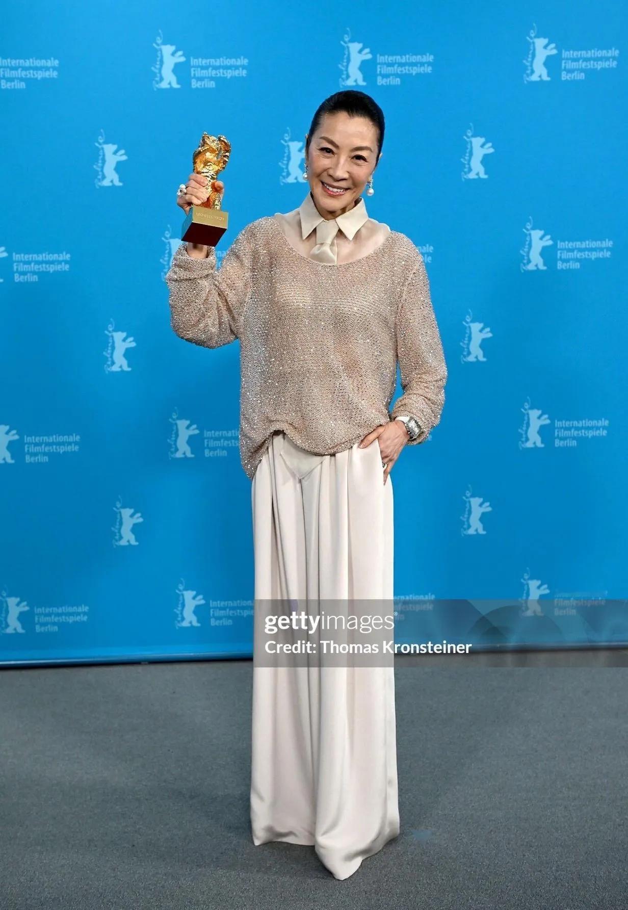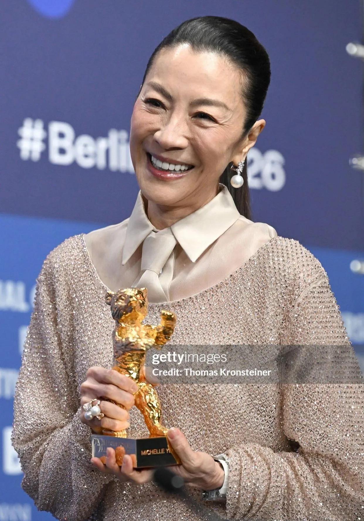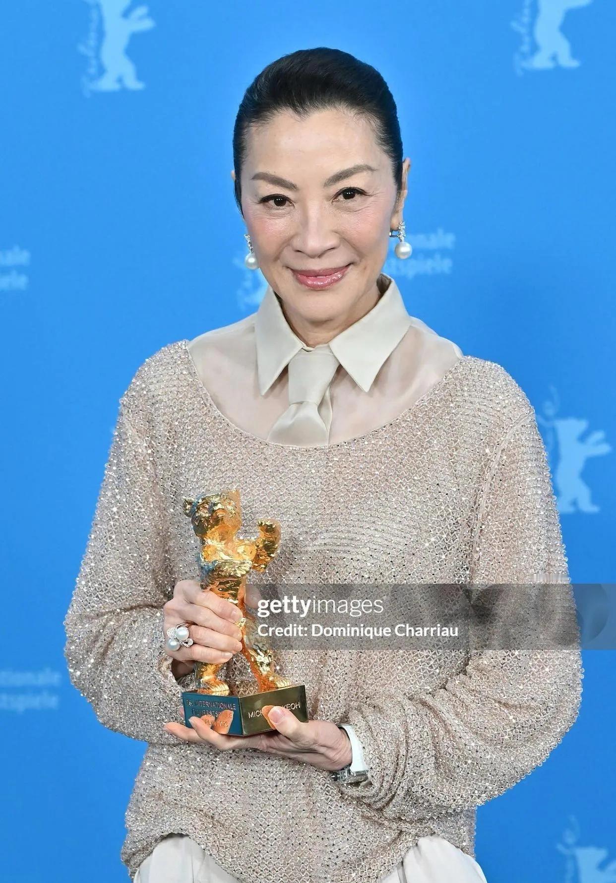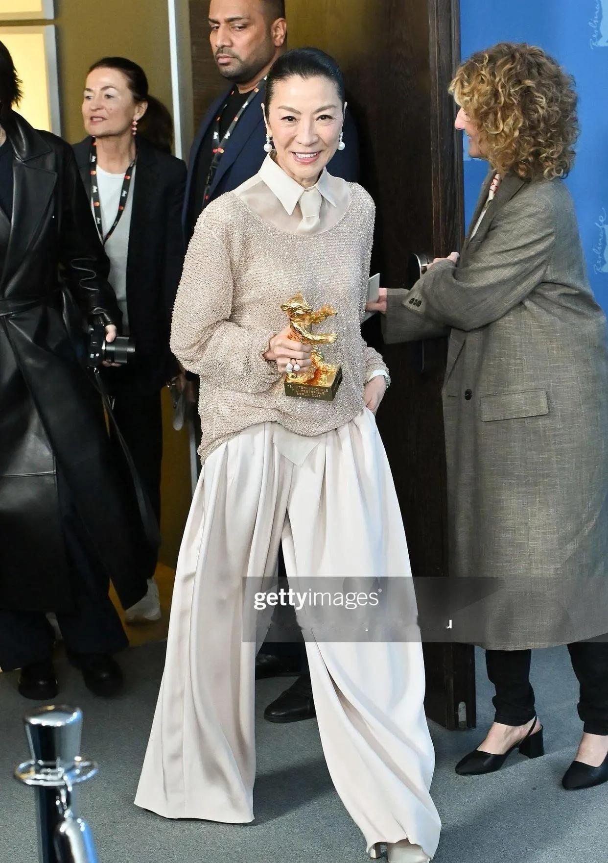 恭喜杨紫琼拿下柏林电影节终身成就金熊奖!✨ 她这次的造型真的太绝了,香槟金亮片上衣搭配米白阔腿裤,同色系的搭配温柔又高级,宽松的廓形反而衬得她气场全开。 珍珠耳饰和钻戒点缀,让整个造型在简约中透着精致,完全是岁月沉淀下来的松弛大气。 从武打女星到奥斯卡影后,再到如今的金熊奖,她用实力证明了女性的力量和无限可能,这才是真正的大女主风范! 杨紫琼 柏林电影节 金熊奖 女明星穿搭