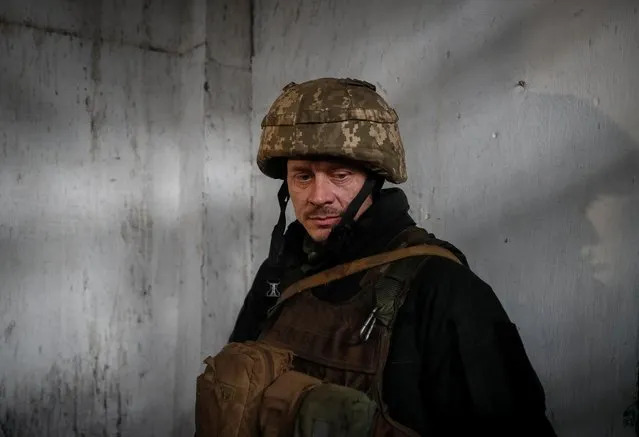 2022 年 2 月 22 日,乌克兰顿涅茨克地区新卢汉斯克市附近的前线炮击期间,一名乌克兰军人站在一个 避难所中。(摄影:Gleb Garanich 路透社)