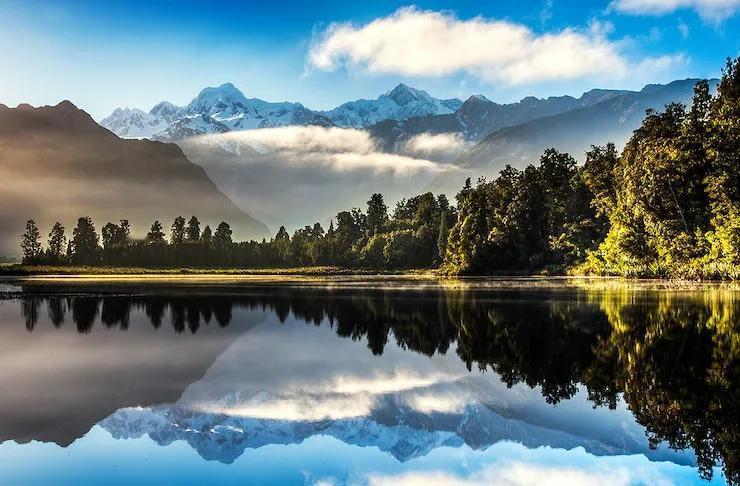 此景只应天上有,岂知身在妙高峰。这样的美景是在新西兰的一个湖泊拍的,你看蓝天白云山峰森林,空气洁净的几乎就像不存在,简直就是一幅风景画。在这样的环境里,人们的心灵都是十分洁净透明的。