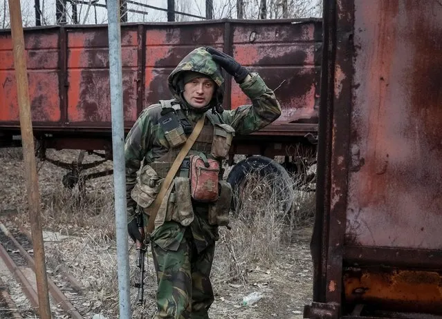 2022 年 2 月 22 日,一名乌克兰军人站在顿涅茨克新卢汉斯克市附近的前线。