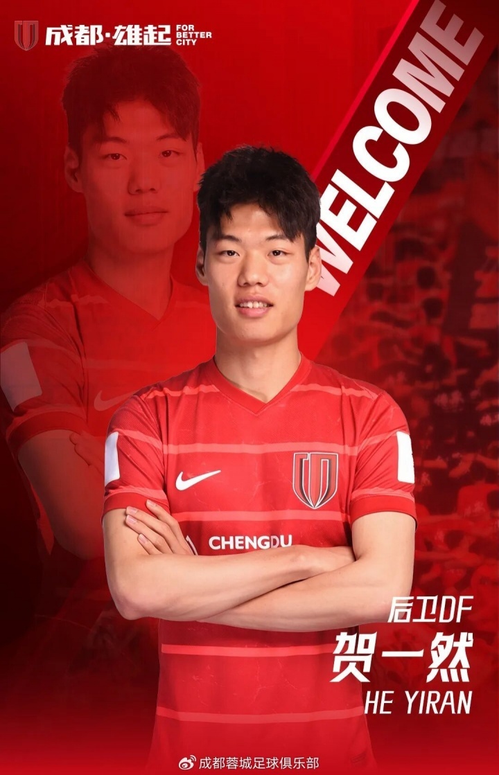成都蓉城官方宣布,U23国脚后卫贺一然加盟。