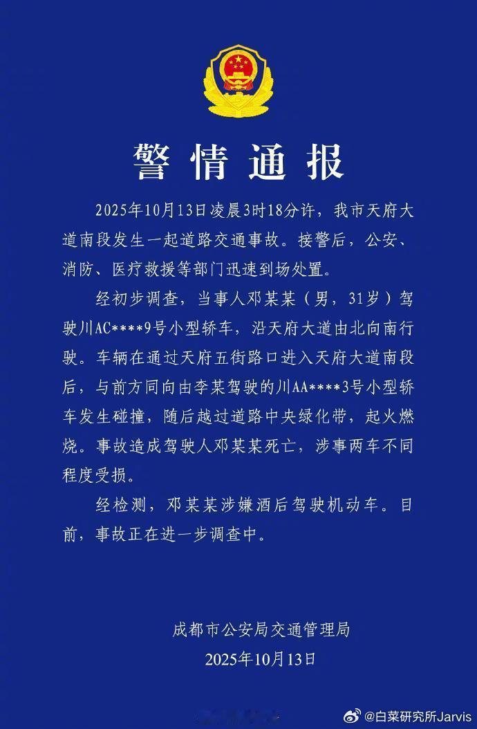 成都天府时间的责任认定出来了,都N视频记者从知情人士处获悉,目前,事故责任认定已完成,驾驶人邓某某负全责。