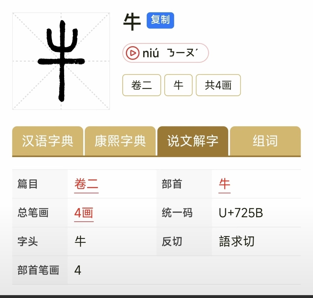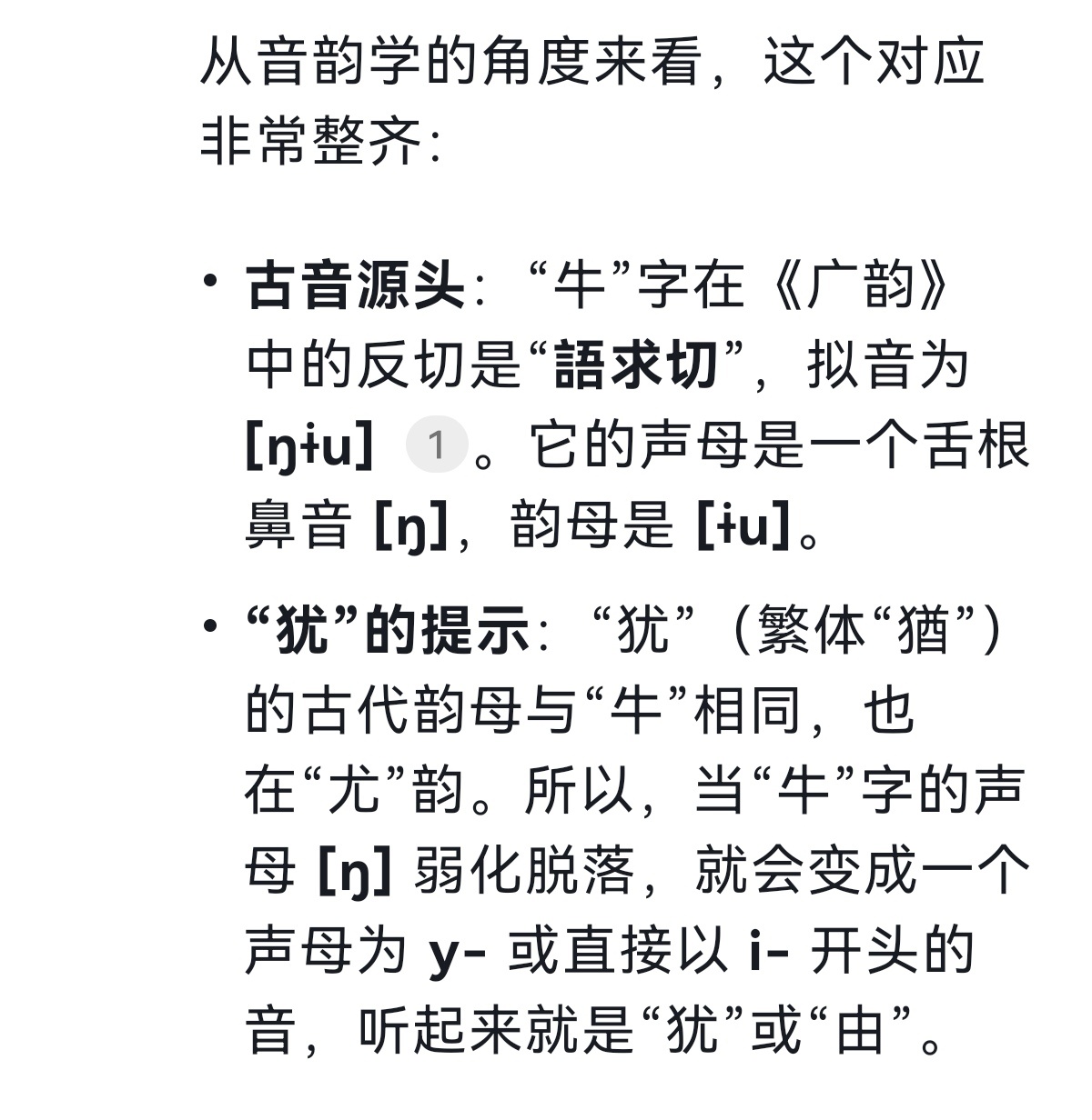 牛字“语求”切,看来也有可能读成犹?语=yu 取Y ,求=qiu取iou,读音you?