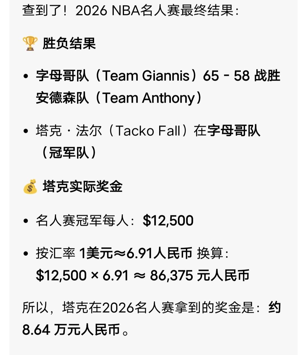 塔克·法尔制霸NBA全明星名人赛 率队夺冠斩获MVP 北京时间2月14日,2026年NBA全明星名人赛在洛杉矶落幕,字母哥队以65-58击败安东尼·安德森队。前NBA高塔、宁波男篮外援塔克·法尔上演内线统治级表现,全场砍下20分21篮板5盖帽,包揽得分、篮板、盖帽三项全场最高,毫无悬念当选本场MVP。 身高2米26的法尔坐镇篮下,轻松完成扣篮与护筐,半场便交出两双数据,成为球队取胜的核心支柱。此役他随冠军队收获名人赛8万多块奖金,亮眼数据与赛场影响力成为本届全明星周末开场阶段的最大亮点。