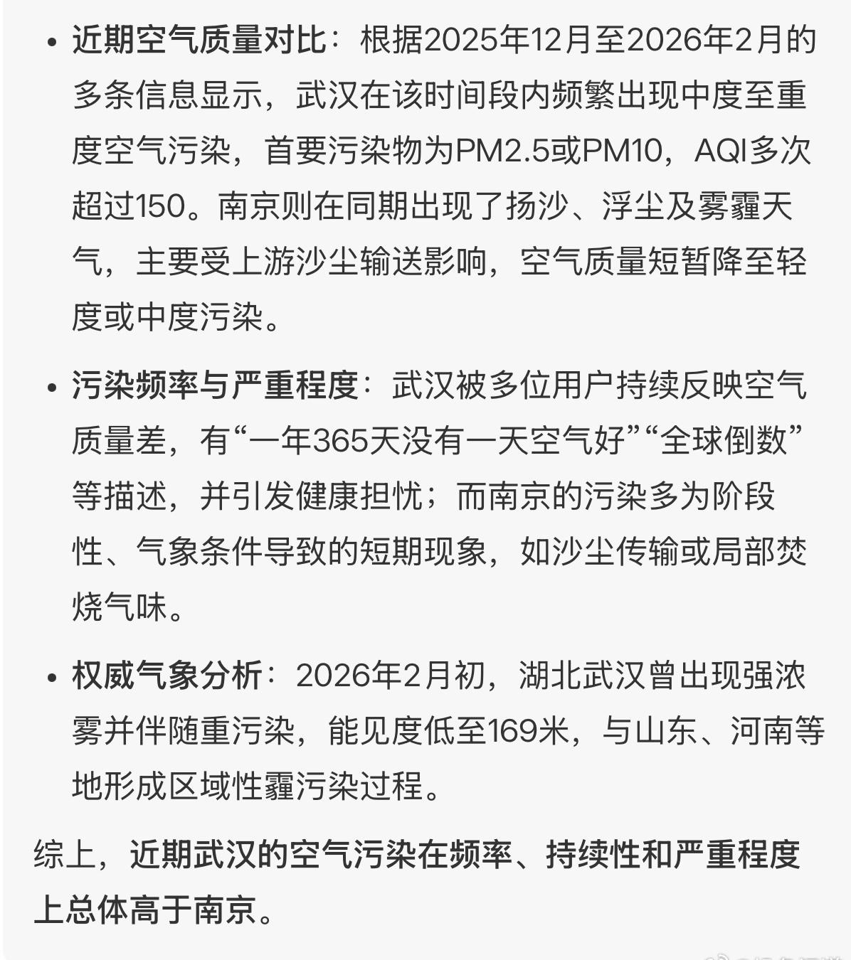 感觉武汉长期雾蒙蒙的,比南京空气差不少,南京现在蓝天不少,是不是大平原,风小,空气流通不好。