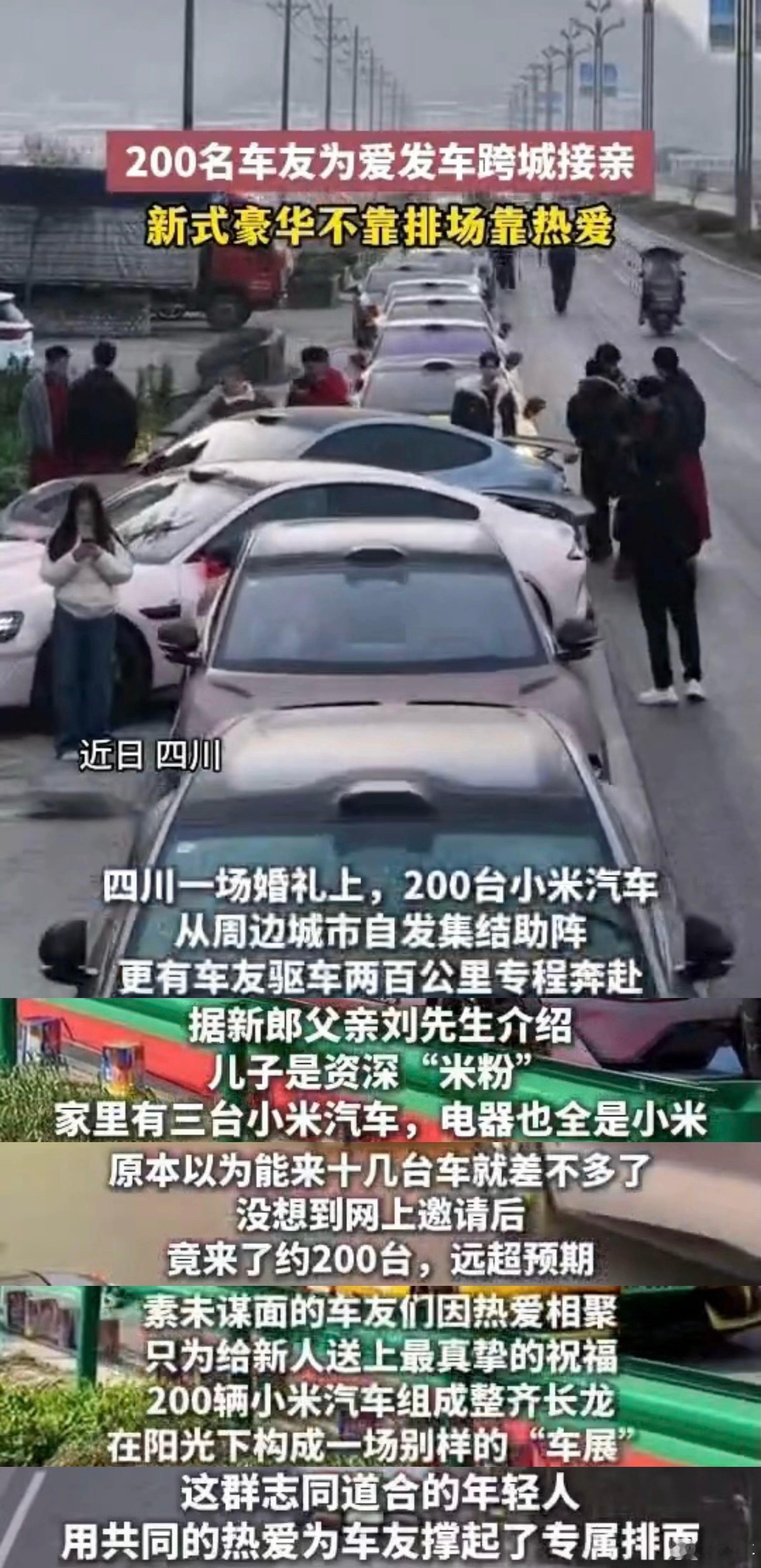 200名车友为爱发车跨城接亲 真的被这一幕暖到了!200 位小米车主,没有官方组织,全是自发赶来,跨城奔赴,就为给一对新人组成婚车队。一整排小米汽车整齐划一,气场直接拉满,一点不比传统豪华车队差。因为同一份热爱聚在一起,不只是车主,更像家人。这不仅是一场浪漫的接亲,更是国产新能源的实力和口碑。从日常代步到婚礼主角,这就是最真实的用户生态,有爱、有凝聚力,也让大家看到国货新能源的底气与温度。
