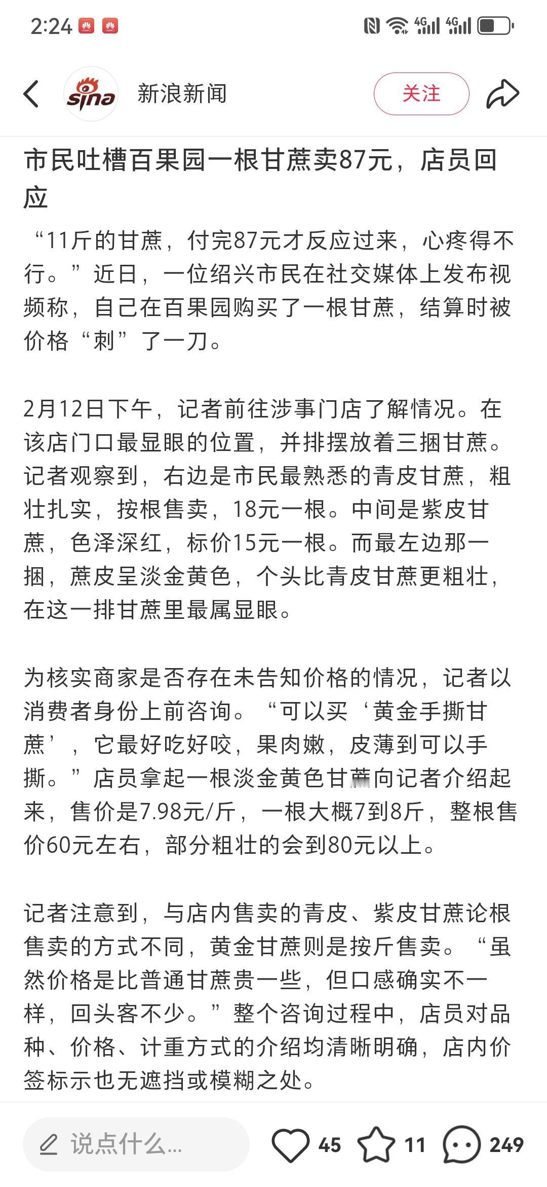 一根甘蔗87元,也真敢卖啊! 近日,有浙江网友吐槽,自己买了一根甘蔗,结果被告知要87元。 什么时候甘蔗也这么贵了,再怎么高级也就是一口糖水,而且普通的甘蔗也足够甜了。 这根甘蔗不知道拿货价格是多少,我估计可能至少有五倍利润。
