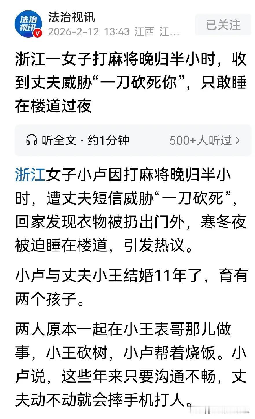 在浙江的一个平凡的小镇上,有一位女子名叫小芳,性格活泼开朗,心怀感恩,平日里总是笑对人生。那天,小芳心情大好,觉得自己“手气爆棚”,仿佛天赐好运降临,便毫不犹豫地扔下丈夫和孩子,直奔麻将桌,享受一夜“豪赌”的快感。她心想:“人生如棋,落子无悔,何须拘泥于琐碎家庭琐事?”可谁曾想,这一场“手气旺”竟引发了一场“风云变幻”。 丈夫张强,平日里温文尔雅,却也有点“小肚鸡肠”。当他看到妻子夜不归宿,还在朋友圈晒得意洋洋的牌局时,心头顿时火起,怒不可遏,发出威胁:“一刀砍死你!”这句话虽带着调侃,却也藏着一股“火山爆发”的怒气。张强的语气中,既有“忍无可忍”的无奈,也有“以和为贵”的期待。 第二天清晨,小芳回到家门口,却惊讶地发现自己的衣服被扔在门外,心中一阵惊慌。她心想:“这不就是‘门外汉’的经典场景吗?”顿时吓得不敢再踏入家门,硬是在楼底蜷缩一夜。邻居们纷纷议论:“这女子,真是‘一失足成千古恨’,但也提醒我们:健康的家庭,内外双调,情感和谐才是根本。” 网友们看后纷纷评论:“不冤!这就是‘因果循环’,你打麻将可以,但别忘了‘家和万事兴’。”有人调侃:“打麻将也要讲究‘天时地利人和’,别把‘健康’变成‘健康危机’。”其实,这个故事告诉我们:真正的健康,不只是身体的强健,更是心灵的宁静与家庭的和睦。只有内外兼修,才能“身心康泰,笑口常开”。 生活就像一场“修炼”,要懂得“顺其自然,逆境中求发展”。正能量告诉我们:家和万事兴