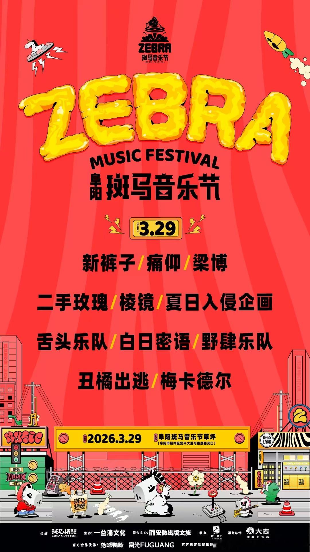 26年安徽首场音乐节阵容来袭 2026阜阳斑马音乐节重磅官宣!华晨宇、任嘉伦、毛不易、新裤子、梁博、痛仰、二手玫瑰集结,流行摇滚双炸场,春日音浪嗨翻安徽!
