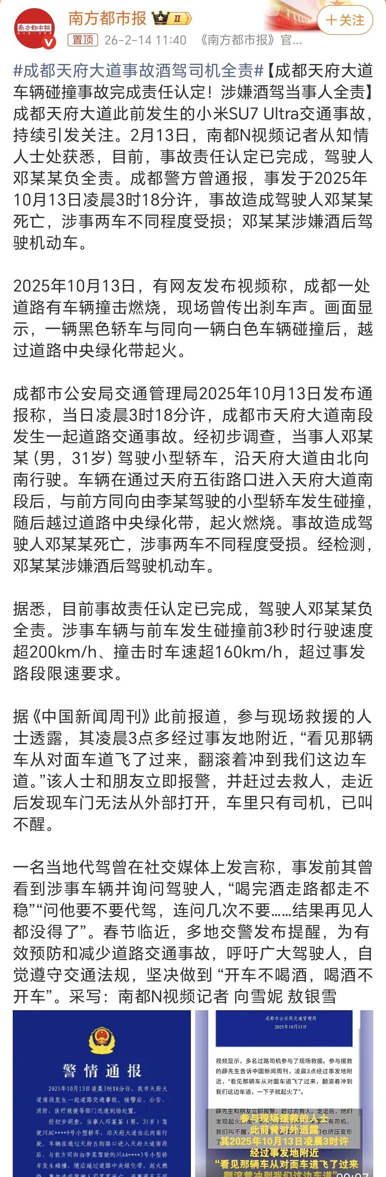 成都天府大道那起事故,责任认定公布了,驾驶员邓某某负全责。 碰撞前3秒时行驶速度超200km/h、撞击时车速超160km/h。酒后严重超速,导致碰撞时没办法及时刹停。 喝酒+严重超速,应该依法严惩。