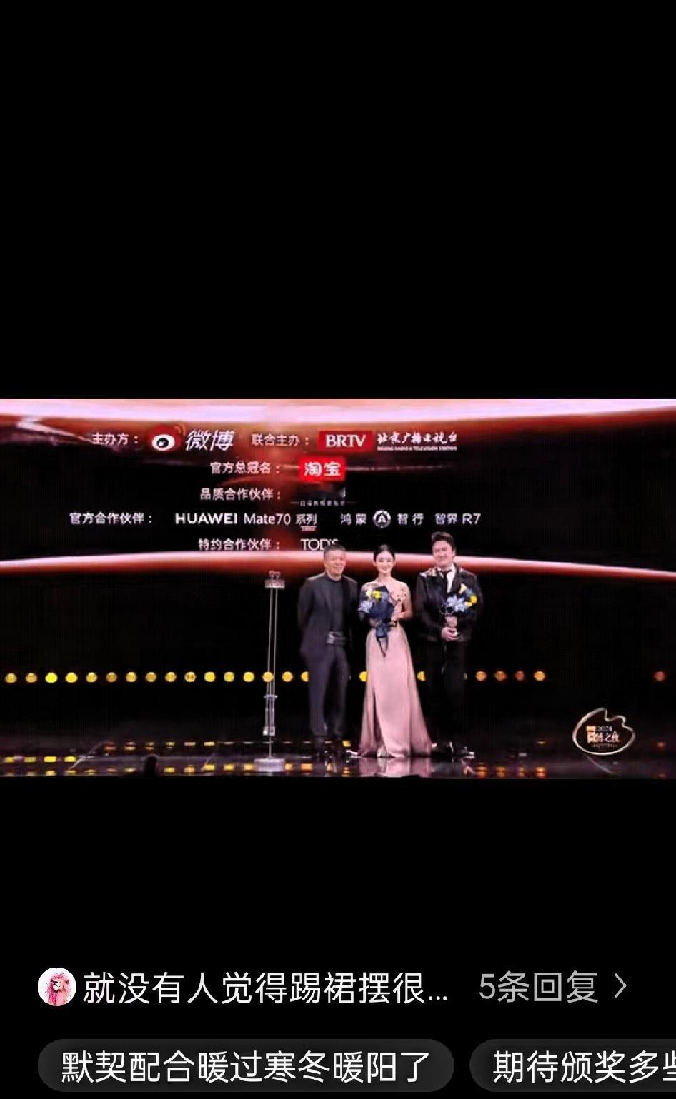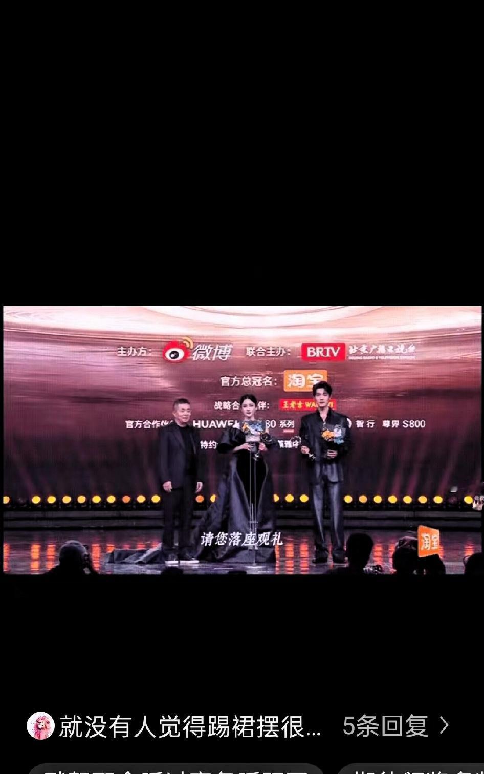 大家可能不知道,去年微博之夜,微博老总曹国伟为赵丽颖颁奖时,留意到她裙摆太长影响站位,旁边的沈腾立刻领会,上前温和地将裙摆整理到身后,整个过程自然得体,大家配合默契,合影顺利完成,画面和谐又体面。 今年为杨幂颁奖时,同样遇到了裙摆影响站位的情况,曹国伟则选择了抬脚轻踢裙摆,同时挥手示意杨幂调整位置,动作偏于直接,少了一些从容和细致,和去年的处理方式形成了明显差别。 其实现场流程紧凑、节奏较快,大家都能理解,但真正让人在意的,不是动作大小,而是待人接物的基本分寸。 面对女生的礼服裙摆,无论是提醒还是协助,都是很简单的小事,却能体现出一个人的下意识修养。没有刻意的对错之分,只是不同的处理方式,带给人的感受截然不同。 职场也好,公众场合也罢,尊重从来都不是刻意表现,而是自然流露的体谅。不慌不忙地顾及他人,不随意做出让人不适的举动,既是礼貌,也是自身修养的体现。 两场画面放在一起,并非要评判谁,而是能让我们更清楚,细节虽小,却最能反映一个人的处事态度。礼仪不分场合,尊重不分对象,舒服的相处,永远来自于恰到好处的分寸感。