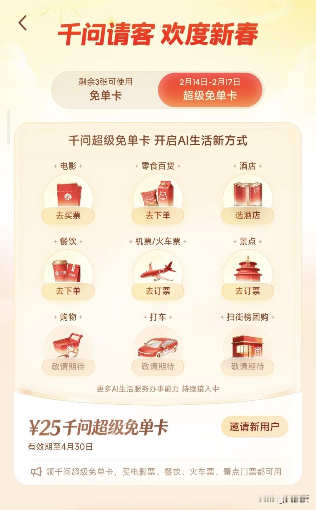 千问真的会让人“上头”! 这几天谁没被阿里千问的“免费奶茶”刷屏?没有吧?说实话,我都喝好几杯了。 让人没想到的是,免单卡第一阶段刚结束,千问的超级免单卡接踵而至,再次增加免单3天 比起第一波,超级免单卡的作用如它的名字一样,更强大了,也更贴近我们的生活。 简单来说,用户除了能用超级免单卡来AI订餐,包括买电影票、订酒店、订景点门票,覆盖了日常吃喝玩乐出行,用途显然更广了。 听说以后你在千问上打车、充话费、团购、购物都能用上,所以压根不用担心不点外卖的话,超级免单卡会不会用不出去的情况? 这就多虑了,有这么多的使用场景,再加上超级免单卡的有效期到4月30日才结束,该担心不够用才是真的。 我估计现在很多人都已经找朋友集卡去了,第一波还觉得不够尽兴的,现在可以继续了!