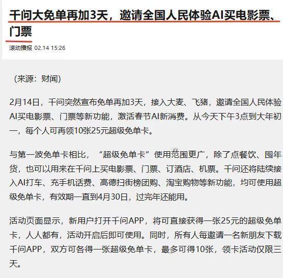 千问推出超级免单卡,又到拼人脉的时候了 这几天千问有多火,应该不用我多说了吧?跟千问说句“帮我点杯奶茶”,就能喝到免单奶茶,这样的体验的确很新奇。不过还有更新奇的,大家有没有发现今天千问新推出了超级免单卡,比第一波的免单卡更给力。 这次“超级免单卡”不光能AI订餐,还能买电影票、订酒店、买景点门票后面据说连购物、打车、充话费都能用!有效期一直到4月底,也不用再着急扎堆参与了。 就这么说吧,如果想看今年春节档有什么值得一看的电影,不用专门打开购票APP。在千问里问“最近有什么好看的电影?”,AI不仅能推荐,还能直接跳转到选座购票页面,用超级免单卡支付。 再比如计划年后去旅游,可以让千问“查一下北京去大理的机票”,它可以调动飞猪的票务查询能,显示航班信息和价格,甚至可以直接预订,这时候超级免单卡又能派上用场了。 估计此时此刻,聪明的人已经在挖掘自己的人脉了,我也去凑个热闹哈哈。