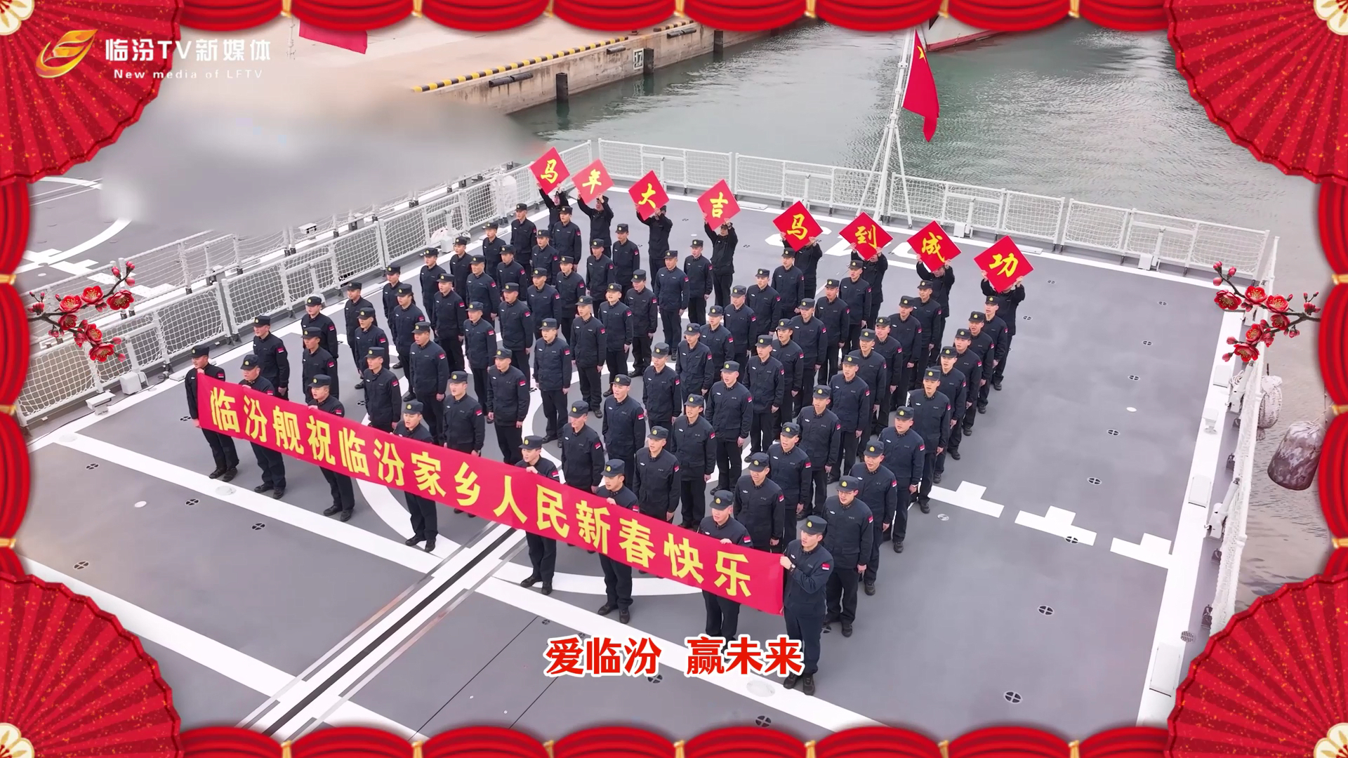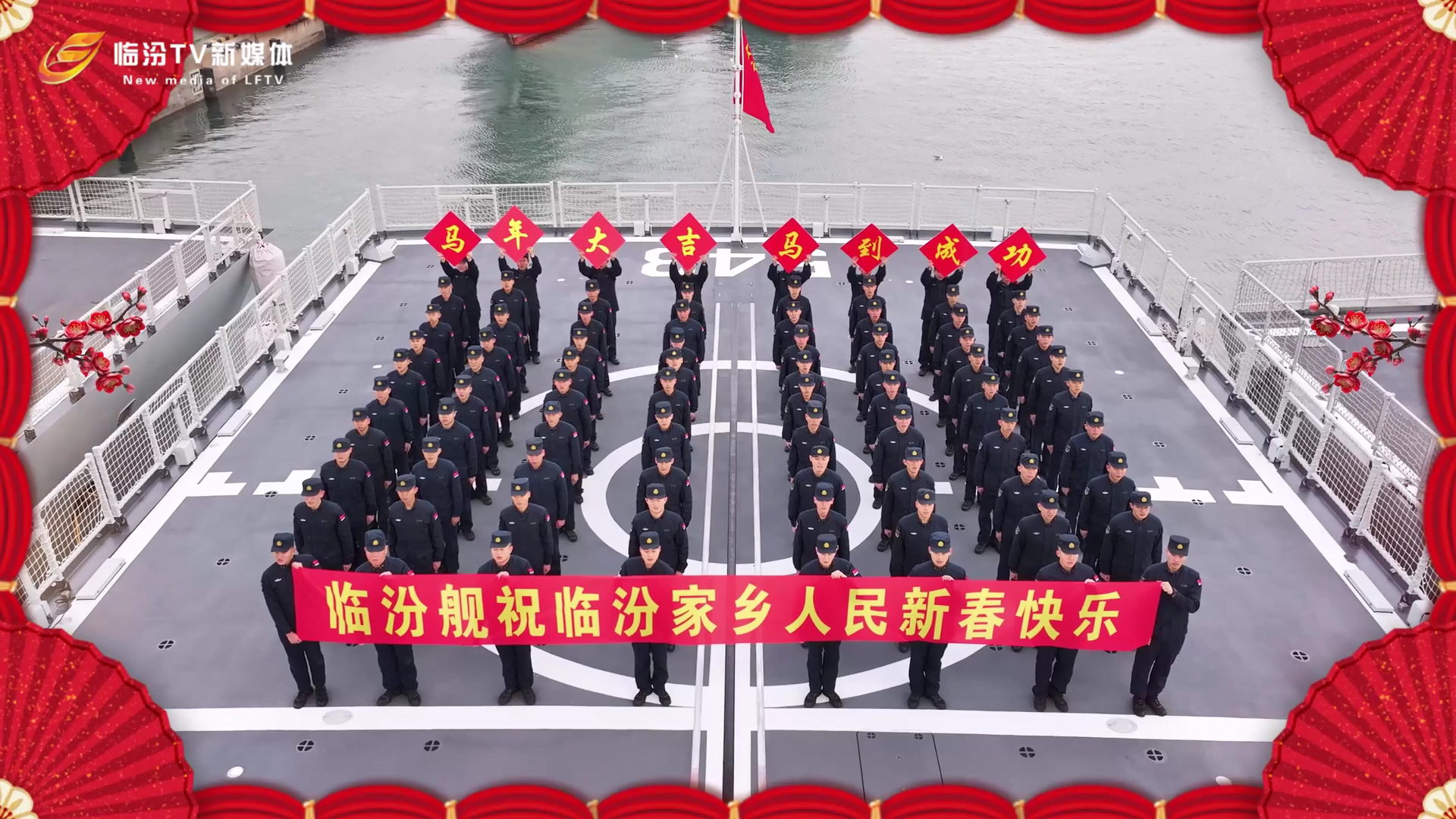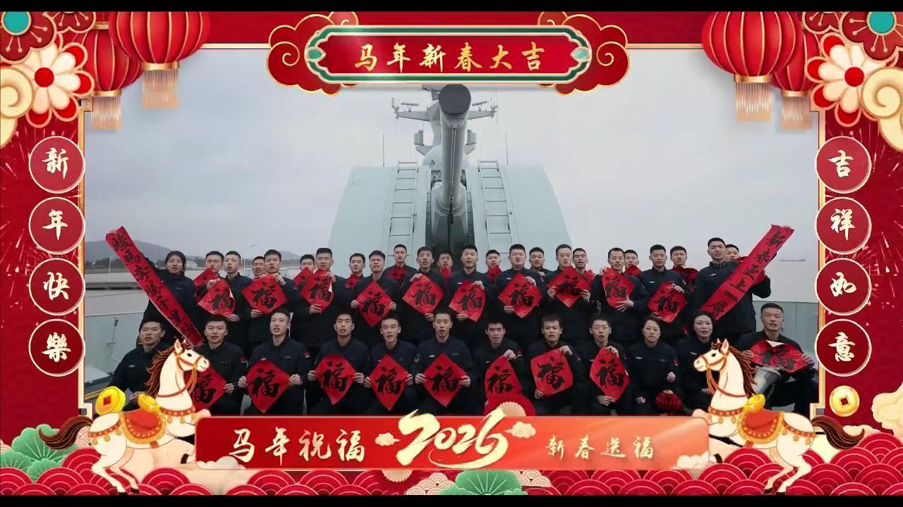 连续四年拜年的福建舰今年是入列后的第一次(图中左下)就去年站在甲板上 烽火问鼎计