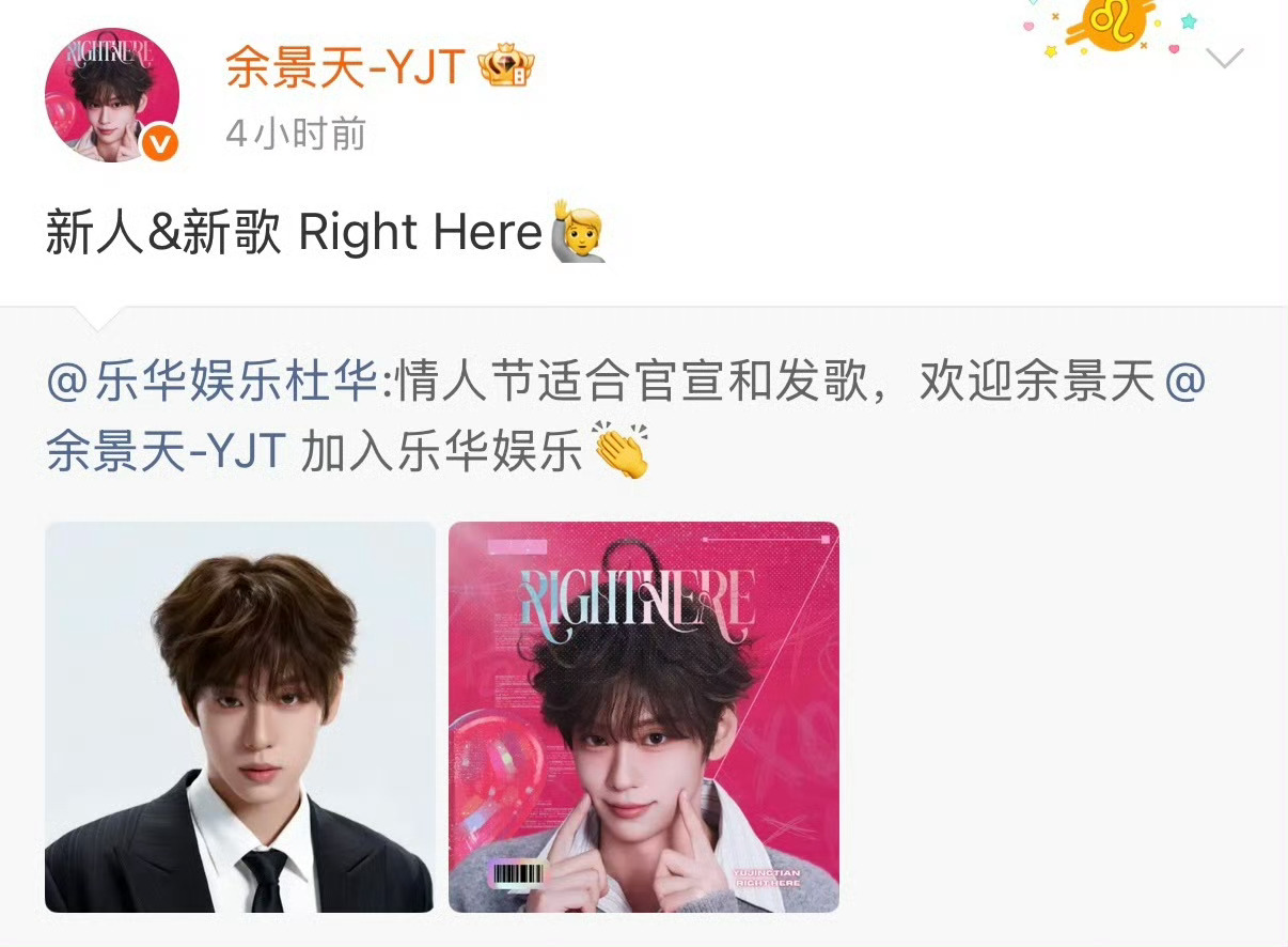 余景天官宣加入乐华情人节最好的消息!余景天正式官宣乐华期待更多作品与舞台💥