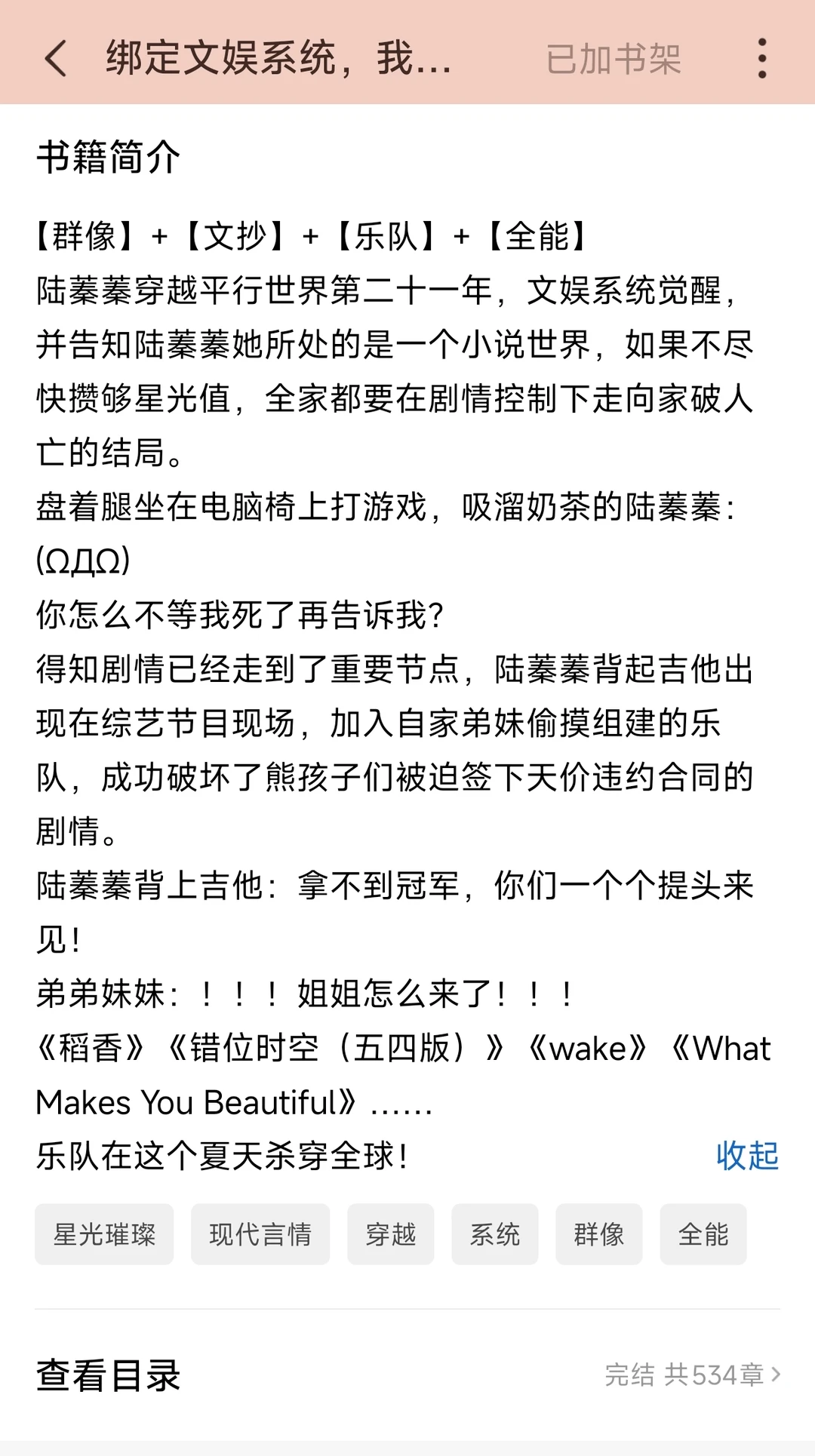 女主绑定文娱系统,为了拯救家人被原男主炮灰的结局,带着弟弟妹妹们组乐队出道。 作者用的许多歌真的挺好听的,感觉我一直在吃安利[笑哭R][笑哭R] 文抄公类型,介意的勿入 女主 系统文 娱乐圈文抄公 ps:最近其实看完了好几本已经完结的文,但是太忙了,都没分享,等我这两天回忆一下每一本的大致内容,我再分享吧[失望R][失望R]