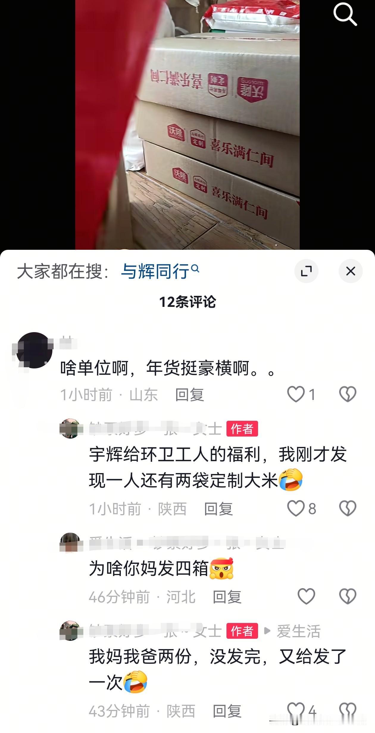 “与辉同行”太“豪横”了! 发给西安环卫工人的坚果和大米, 不但人手一份,而且剩下没发完的还重复发! 刚才刷到一个网友的视频,说她妈妈得了四份坚果礼盒,网友评论区问怎么回事,你家那么多,博主赶紧澄清:因为她爸爸妈妈两人都是环卫工,得了两份,还有两袋定制大米,没发完,又发了一次! 宇辉主打宁可多发一份,也不漏掉一人呀!不图虚名,不缺诚意,宁可多送,绝不亏欠。这格局,真的太圈粉了! 董宇辉 与辉同行
