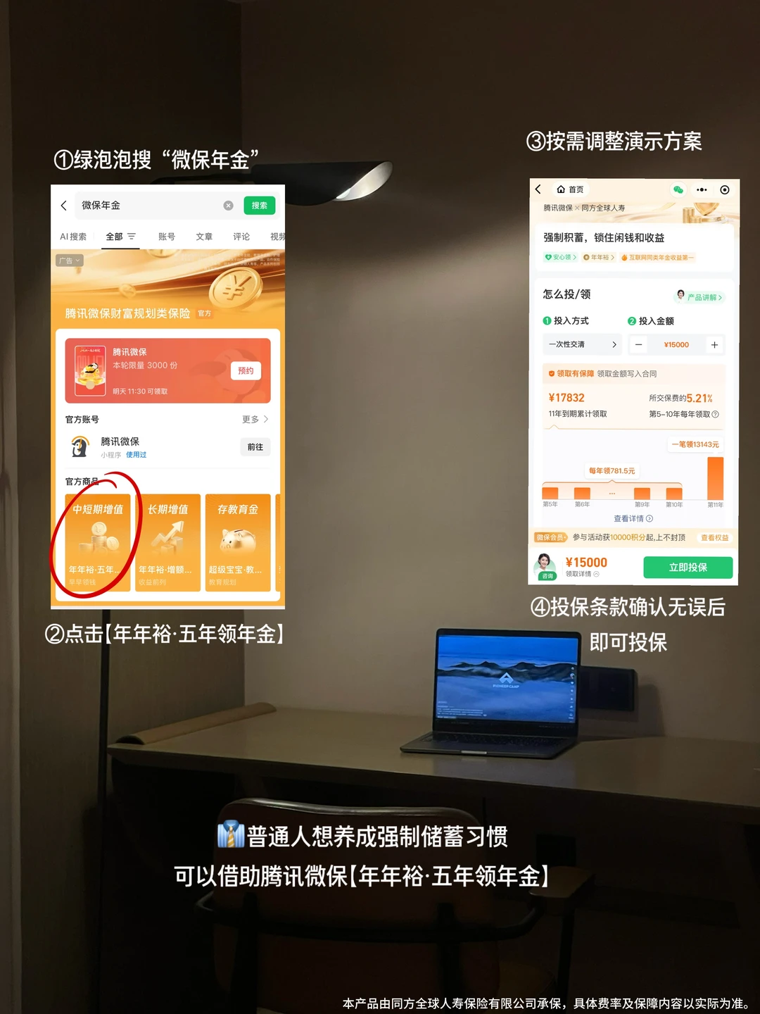 绿泡泡搜【微保年金】,点击年年裕五年金根据演示方案投保即可