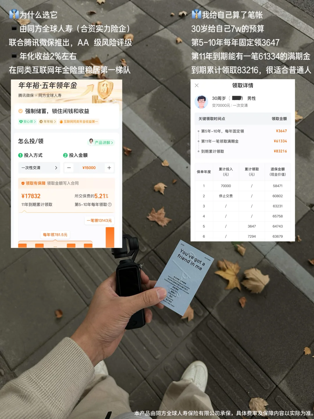 ③合同保障安心:它的收益写入合同,刚性兑付。第5-10年每年领取所交保费的5.21%,第11年一笔领完。而且金额是固定的,受合同严格保护,这种确定性,很适合普通人的规划。