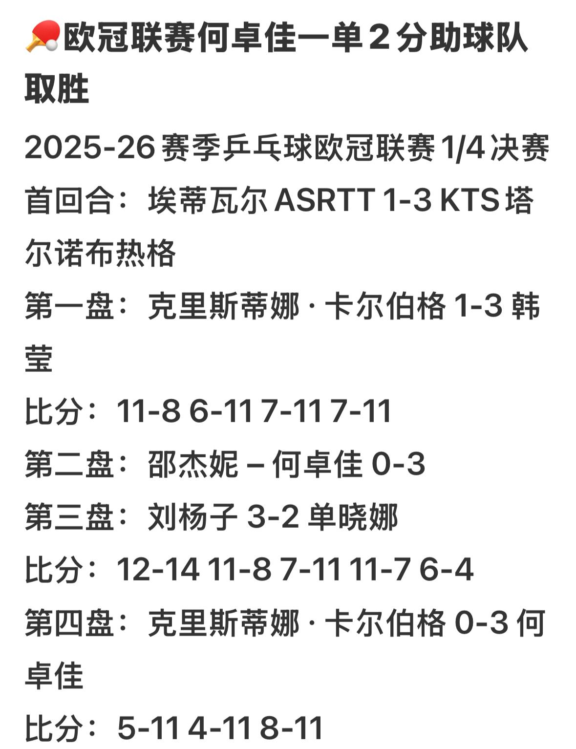 欧冠联赛何卓佳一单二分助力球队获胜🏆 2月14日,何卓佳在参加欧洲联赛中 一单二分, 助力球队获胜! 国乒运动员打欧冠也是一条出路, 而且何卓佳在国内参赛机会不多, 到国外打联赛, 既能提高自己的技战术水平, 也在经济方面有所收入, 现役国乒选手, 到国外打联赛, 水平在当地俱乐部称得上最强, 打联赛也可以提高自信心和 幸福感! 何卓佳与韩莹一个俱乐部, 佳佳打不好队内赛, 外战获胜率非常高, 恭喜莎莎的好朋友何卓佳!