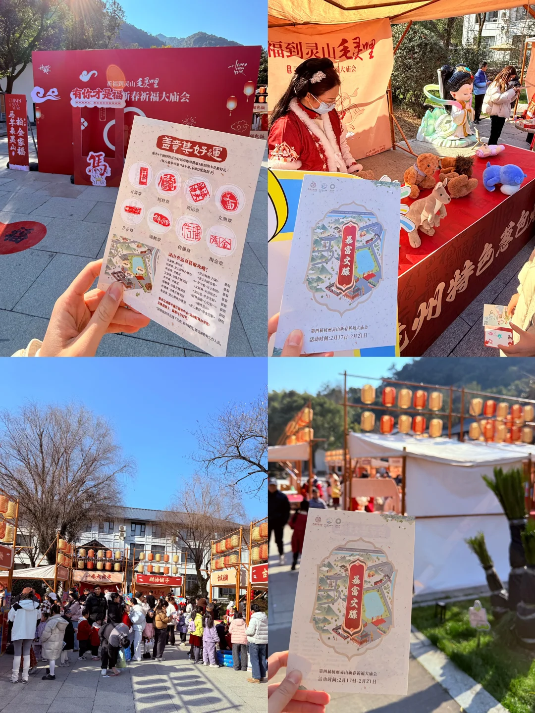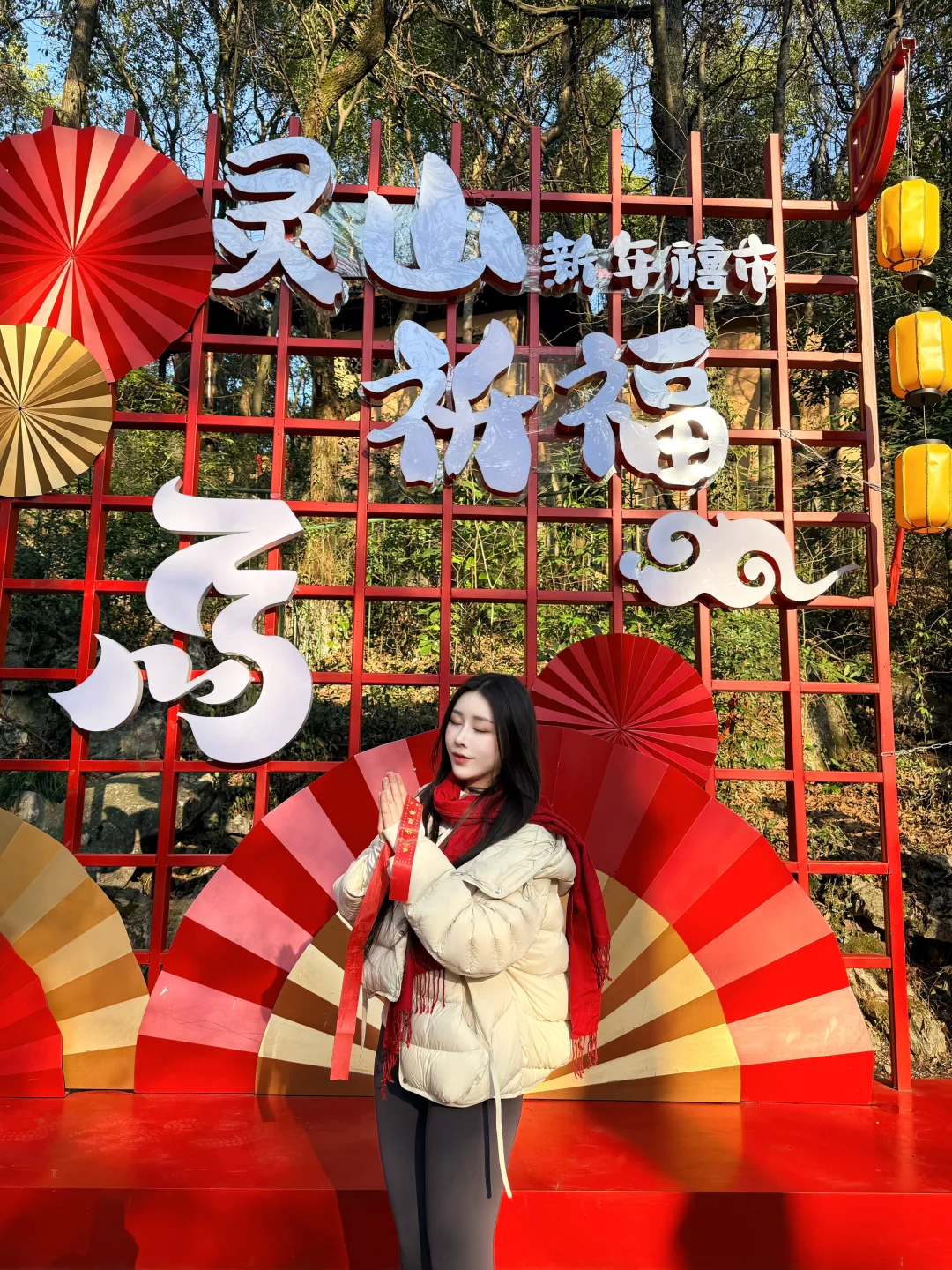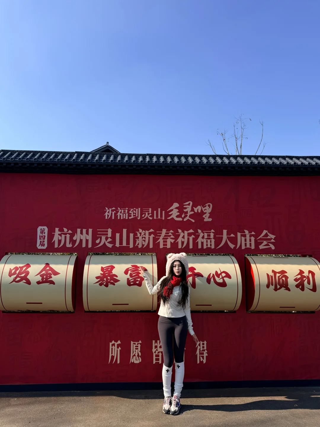 杭州灵山景区停车场——网红打卡红墙——新春祈福大庙会——灵山幻境——“乌龙洗心池”进行水占——沧海阁敲钟祈福、系祈福带