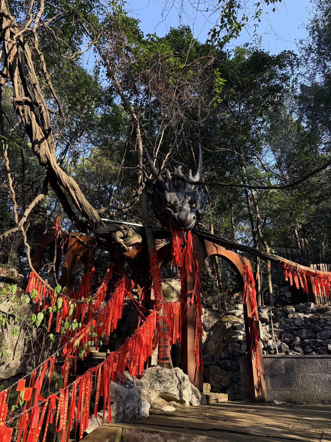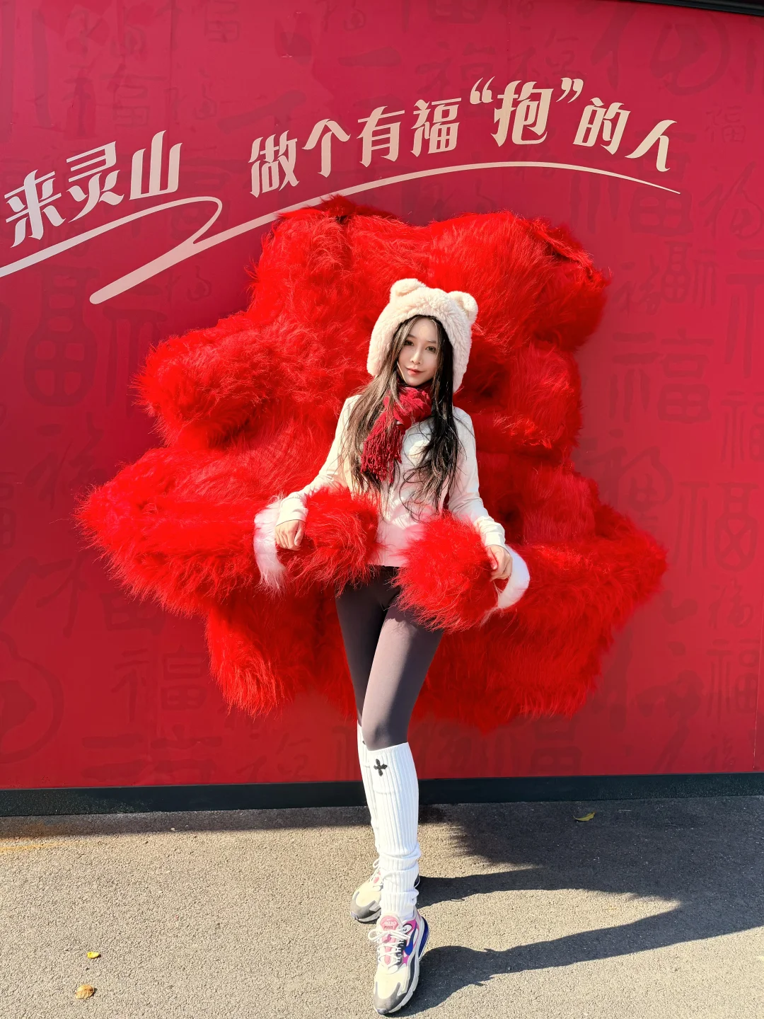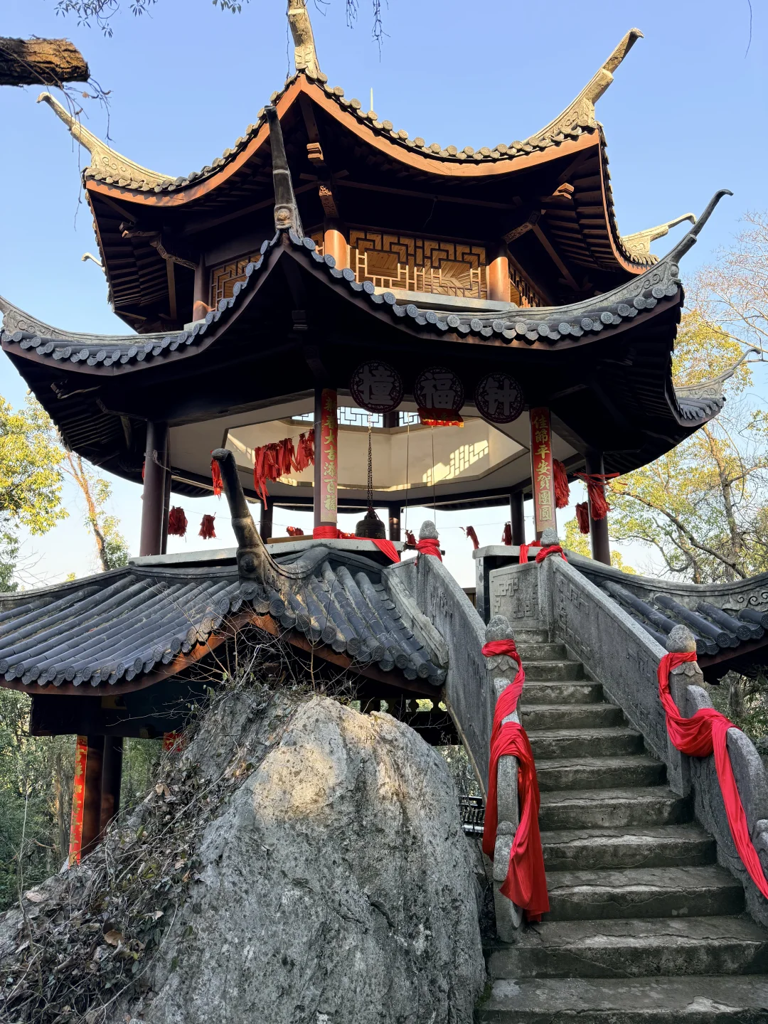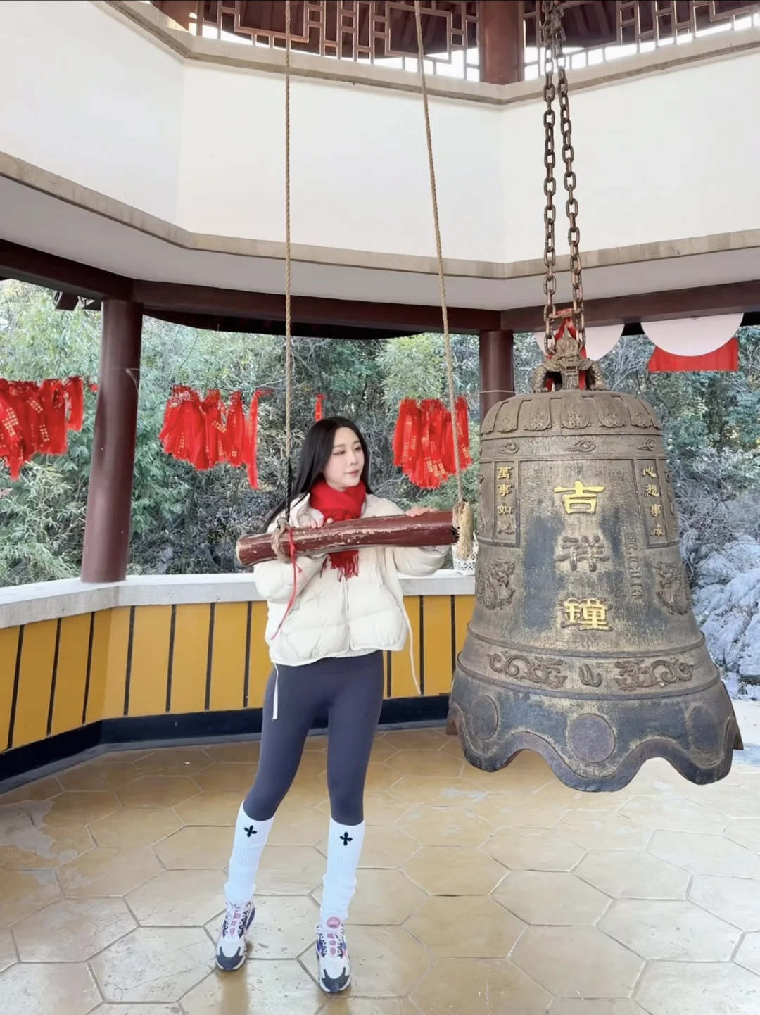 杭州灵山景区停车场——网红打卡红墙——新春祈福大庙会——灵山幻境——“乌龙洗心池”进行水占——沧海阁敲钟祈福、系祈福带