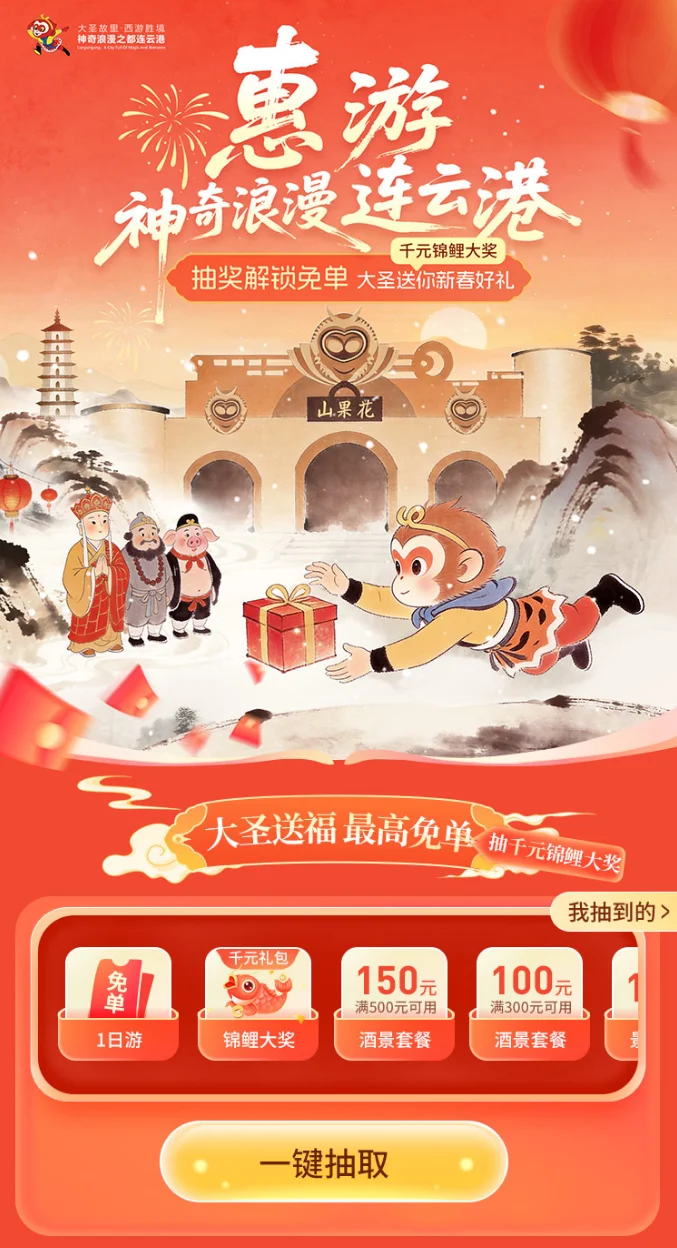 登录同程旅行APP/小程序进入“惠游—神奇浪漫连云港”活动页即可参与免费抽奖,让我看看谁是那个幸运锦鲤!