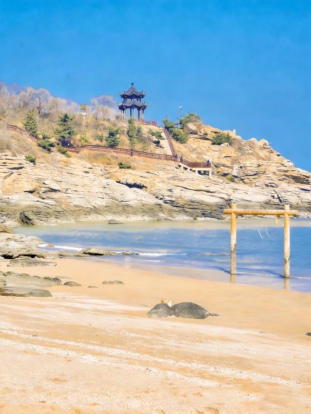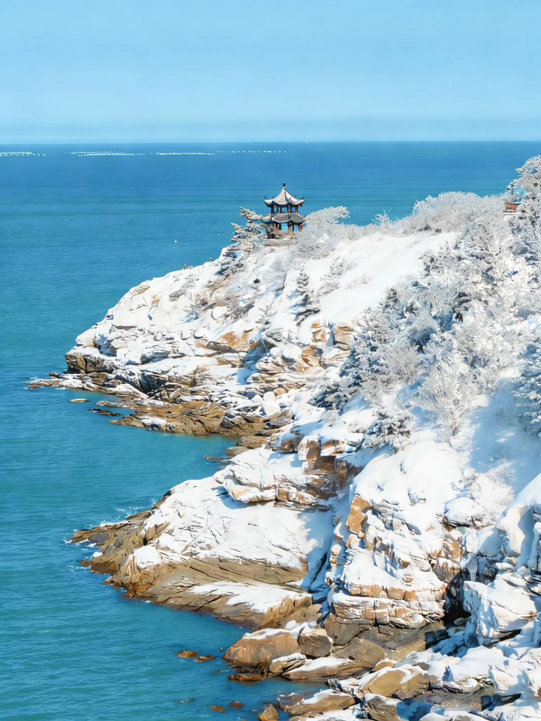 ▫️连岛 冬日限定海冰奇观!栈道边礁石裹着晶莹冰挂,海浪拍岸溅起碎玉,大沙湾日落把海面染成橘子海,人少随便拍都是电影感。