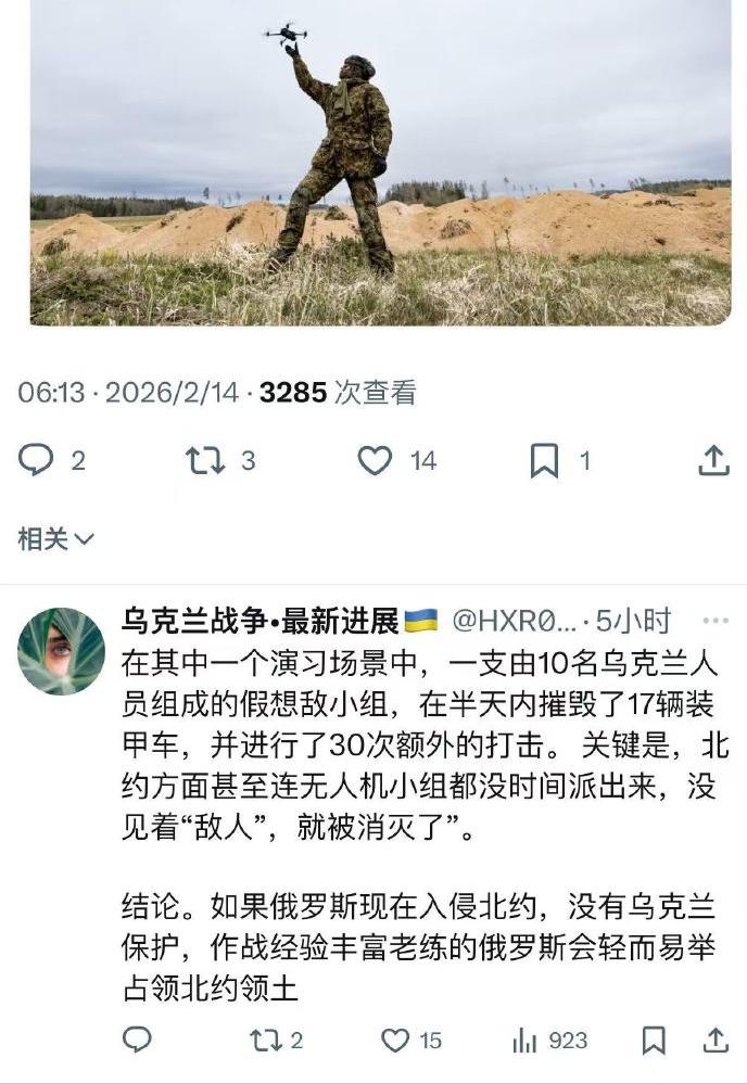 10个乌克兰士兵就干掉了北约两个营,你敢信?[捂脸] 哈哈,现在终于知道为什么北约要出这么多钱帮乌克兰打仗了,他们真的是打不过俄罗斯啊。 对俄罗斯的恐惧真的是发自内心的啊。 估计这应该是北约参演人数的上限,不是这10个乌军士兵战斗力的上限。[笑哭] 原来北约是在给乌克兰交保护费,而乌克兰也是尽心尽力地保护了他们。[笑哭] 原来我们都小看了乌克兰。 北约那帮少爷兵果然是不能打仗的。俄罗斯如果没有乌克兰的阻挡,他们真的可以平推至巴黎。 无人机已经改变战场规则,似乎北约还没有真正适应这一点。 好巧,我们的无人机是世界第一的。 好巧哦,好像 我们的反无人机能力也是世界第一呢。 [笑哭][笑哭][笑哭][笑哭][笑哭] 点右上角关注我,我们一起去看这个魔幻的世界