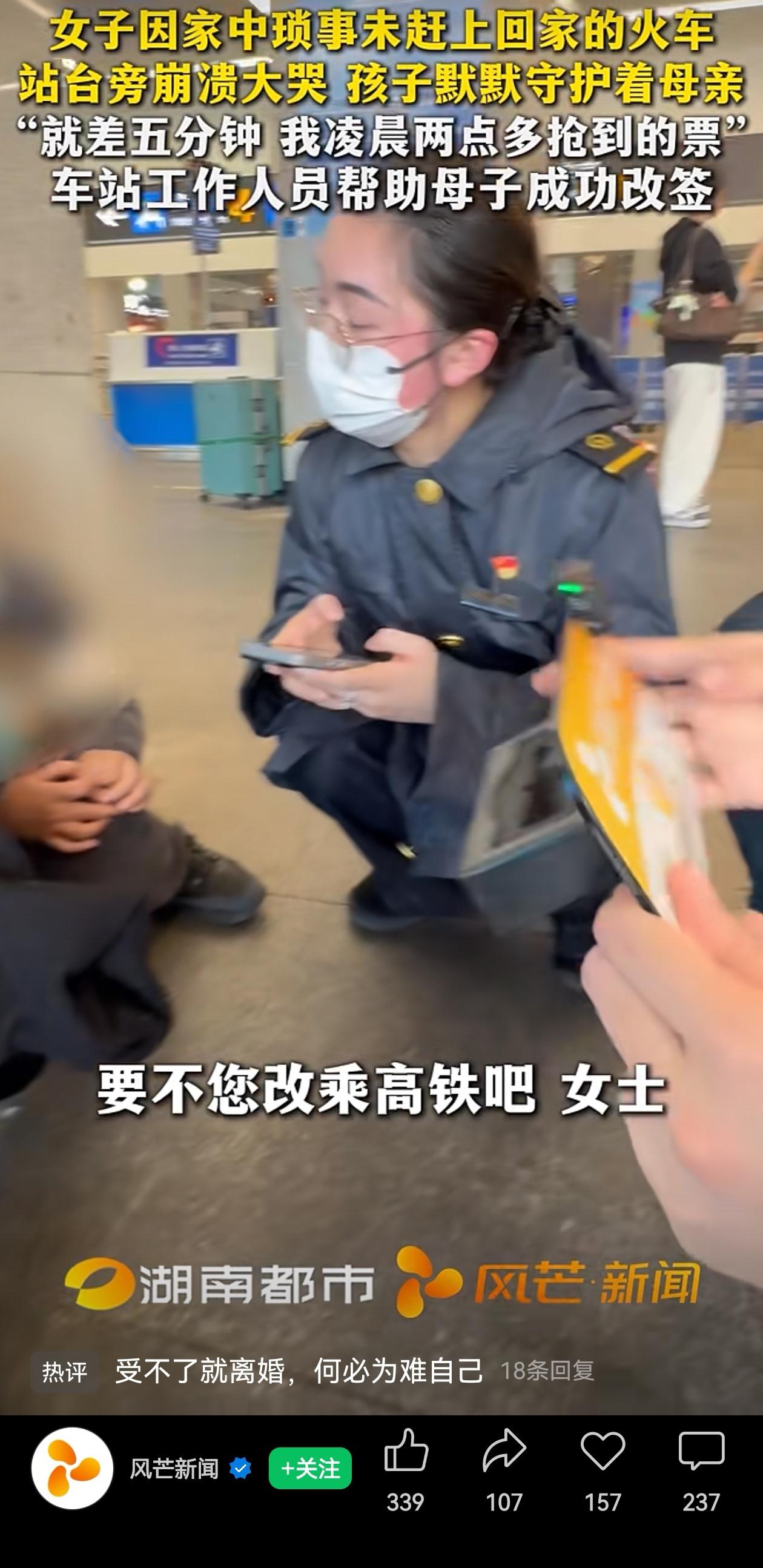 心酸又暖心!2月14日,湖南长沙火车站这位妈妈,因为晚了5分钟没赶上回永州娘家过年的火车,当场就崩溃大哭:“半夜2点抢到的票,他还要我洗碗,还要扫地,太欺负人了!感觉明年还要跟他过,我好受不了啊……” 太让人心疼了!其实这哪是错过一班车的事啊,那哭声里,不是平时攒下的委屈吗?凌晨两点多熬夜抢票的辛苦,独自带上儿子赶路的狼狈,被自己老公要求做家务事逼得错过火车…… “晚了5分钟”的委屈一下子涌上来,坐在车站内嚎啕大哭!太让人心疼啦!这就是“成年人的崩溃,往往就在这么一件小事上啊”。 暖心的是妈妈身边还有个小小的身影,妈妈哭得像个泪人,儿子知道妈妈的委屈,理解妈妈为什么嚎啕大哭,默默在身边,就那么安安静静地守着,陪伴着。 更暖心的结局是,车站工作人员快步上前,听到妈妈的哭诉后,耐心安抚、迅速帮忙改签高铁。还给出了坐地铁快速搭上高铁站的建议,不仅解决了问题,更接住了那份崩溃的情绪。 对那位妈妈来说,这不只是改签了一张票,而是有人在她最无助的时候搭了一把手。 生活有时候就是这样,一边有手忙脚乱的心酸,一边是猝不及防的温暖。 愿这位妈妈顺利回了娘家,好好过个年,歇一歇。也祝愿每个人在快要撑不住的时候,身边都有默默守护的人,都能被一双温暖的手牵到。 信息来源:风芒新闻